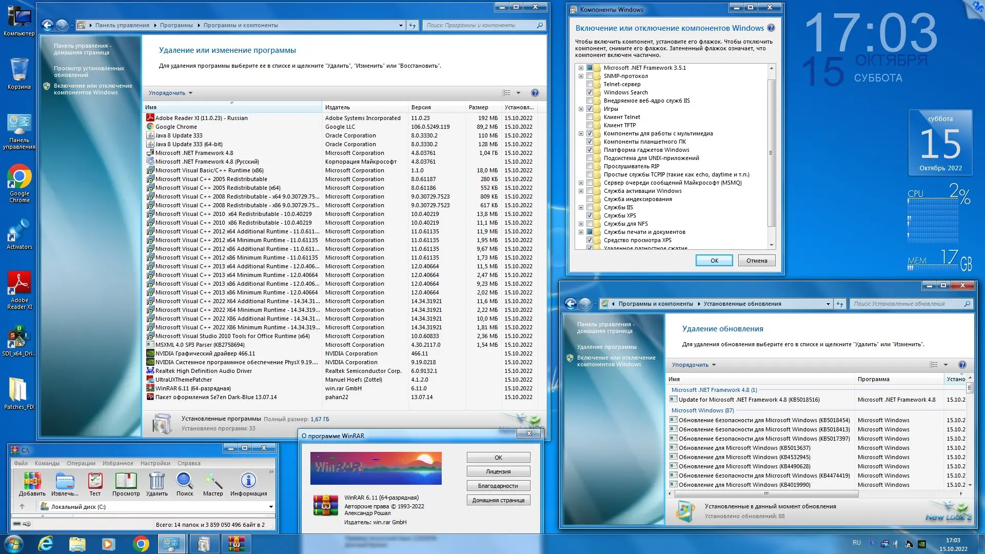 - Автоматическая установка популярных приложений: Google Chrome, WinRAR, Java SE Runtime Environment, Microsoft .NET Framework, DirectX, Adobe Reader XI и UltraUXThemePatcher.