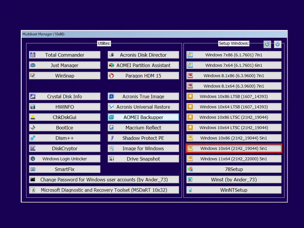 Multiboot Collection Full — это мощный мультизагрузочный сборник, предназначенный для работы с любыми версиями Windows от 7 до 11 (x32/x64 Bit). Он обеспечивает быстрое создание универсального загрузочного носителя, способного осуществлять установку, восстановление и ремонт системы по различным сценариям. Версия full включает последние обновления, актуальные сборки WinPE, автоматизированные установки и поддержку работы с двумя раздельными флешками, а также полную поддержку режима UEFI.