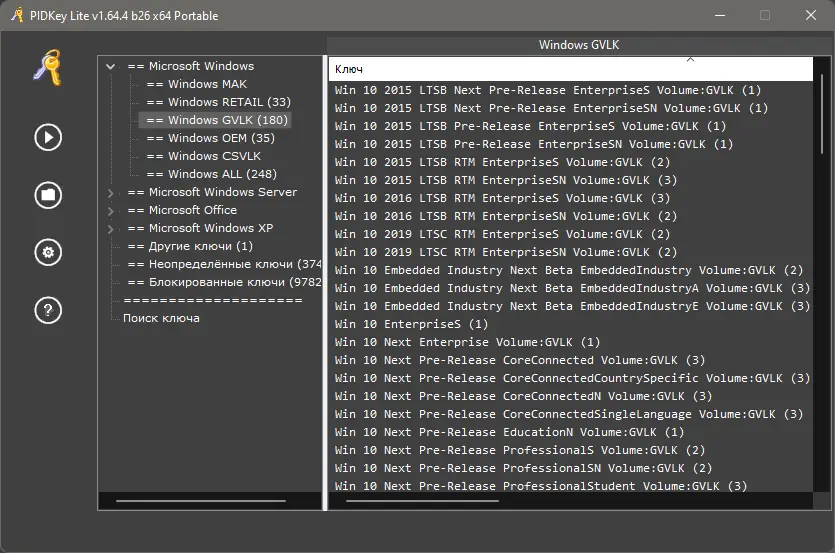 PIDKey Lite — это компактное и удобное решение для просмотра, обновления и хранения информации о ключах для продуктов Microsoft. Программа предназначена для быстрого и безопасного управления ключами различной версии Windows и другими продуктами, обеспечивая актуальность базы данных и простоту работы.