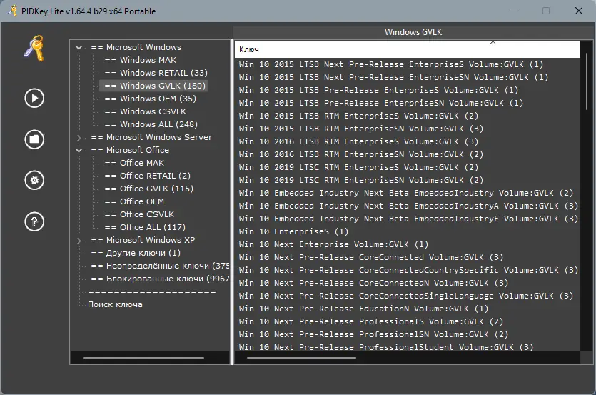 PIDKey Lite предназначена для просмотра, обновления и сохранения в базе информации о ключах для продуктов Microsoft. Это современное решение, позволяющее управлять ключами через создание SQL-базы данных, что значительно облегчает поиск, добавление и обновление информации о ключах различных версий Windows.
