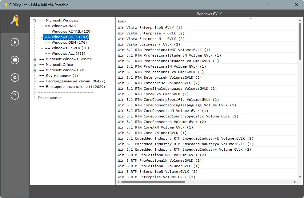 PIDKey Lite предназначена для просмотра, обновления и сохранения в базе информации о ключах для продуктов Microsoft. Программа позволяет эффективно управлять лицензионированием различных версий Windows и Office, облегчая процесс активации и контроля ключей.