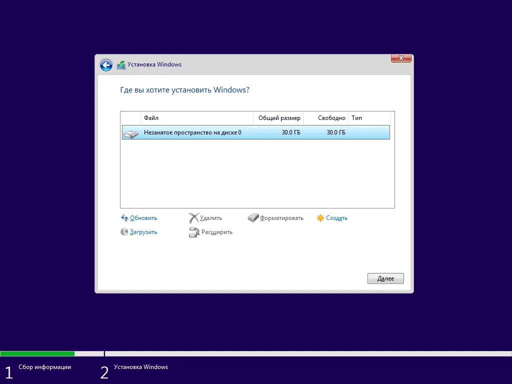 - Выберите раздел диска для установки, автоматически происходит форматирование и подготовка