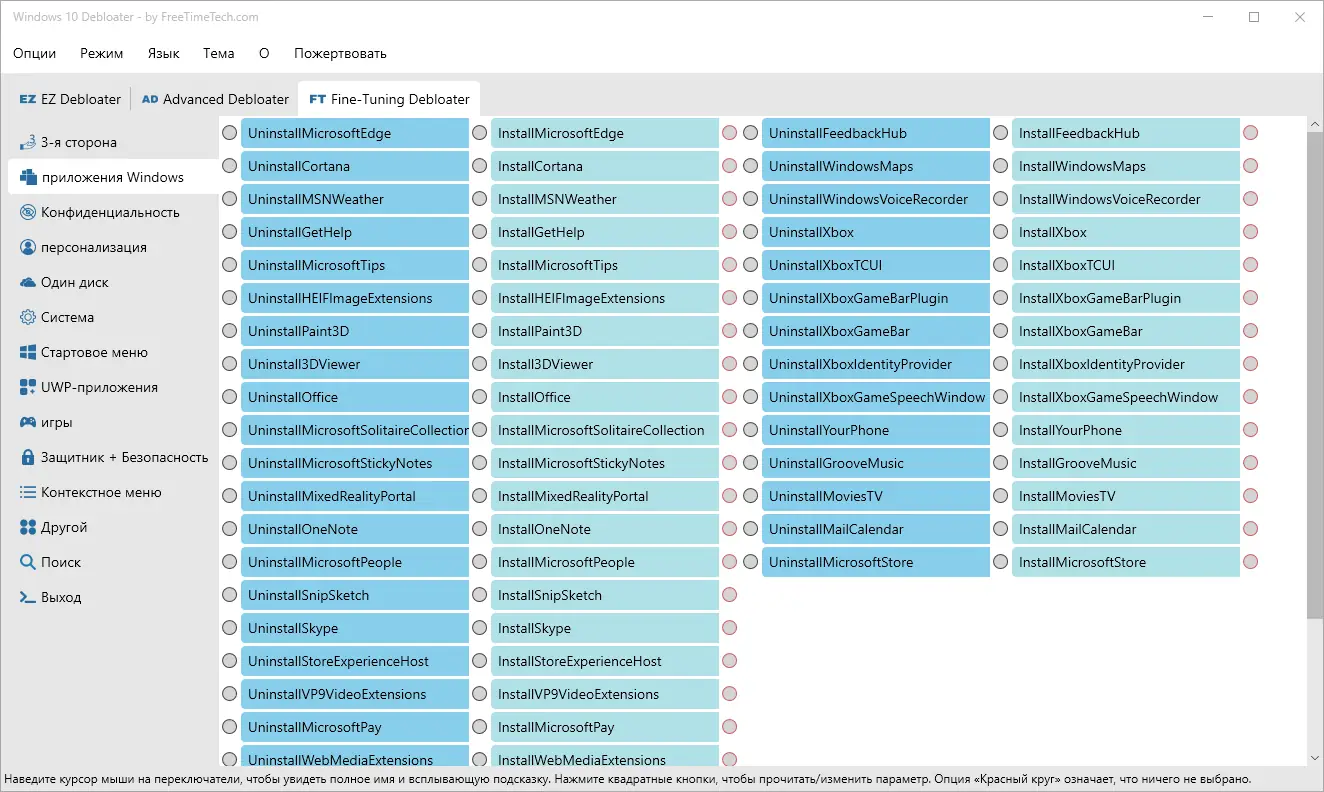 - Удаление предустановленных приложений Windows 10, таких как Microsoft Edge, OneDrive, Cortana и другие