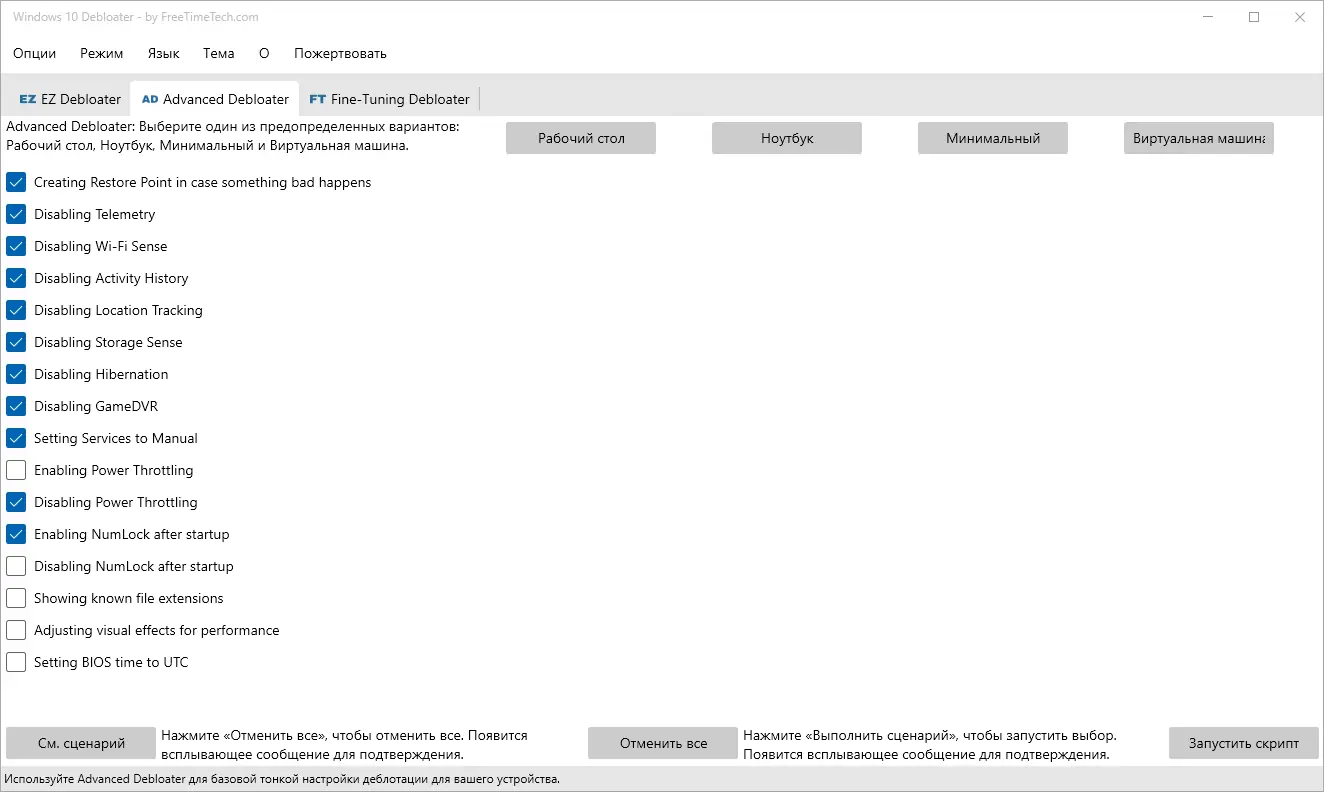 Инструмент предоставляет пользователю удобный графический интерфейс для запуска различных сценариев PowerShell, что делает процесс оптимизации быстрым и понятным. В удобных вкладках представлены функции по удалению предустановленных приложений, отключению телеметрии, а также настройке элементов интерфейса Windows. Благодаря этому, пользователь может самостоятельно управлять характеристиками системы и улучшать её работу без необходимости глубоких знаний в области скриптинга.