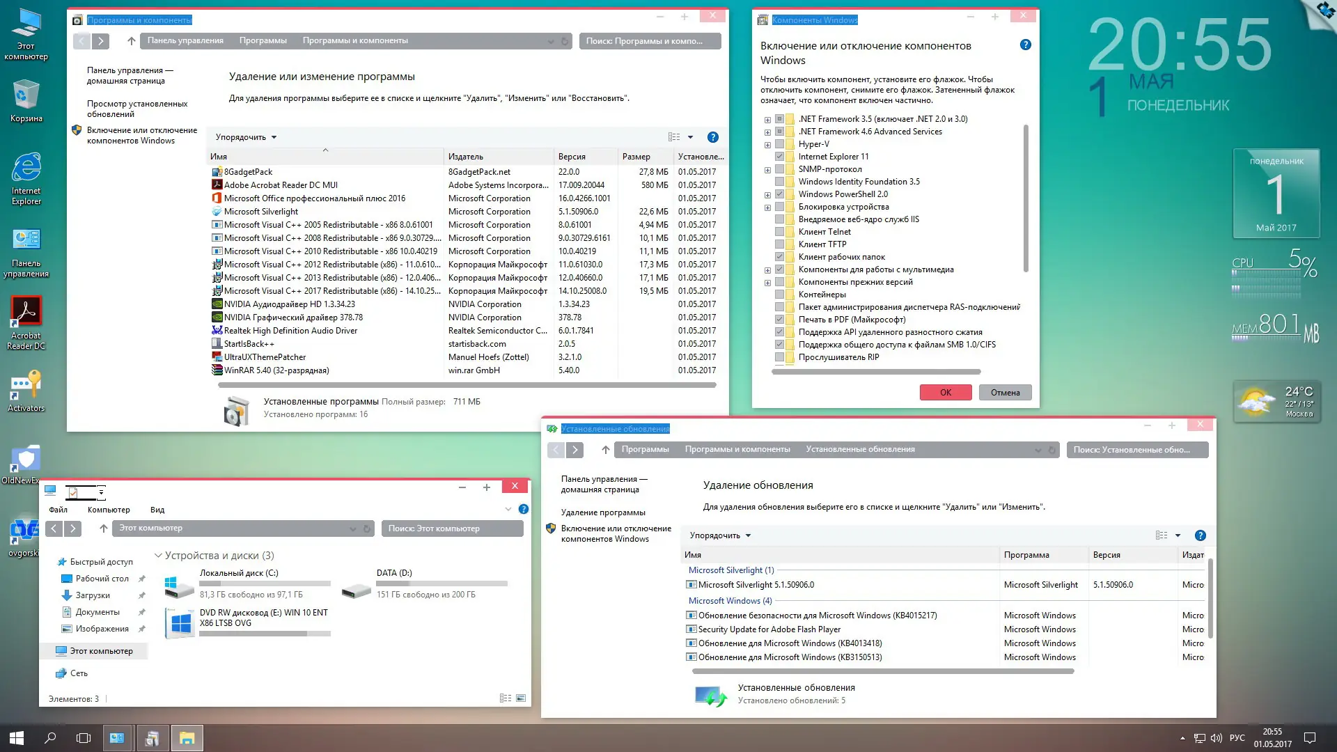 - Автоматическая установка популярных программ: офисные компоненты, просмотр PDF, архиваторы, патчи для использования сторонних шаблонов тем и подключения гаджетов.