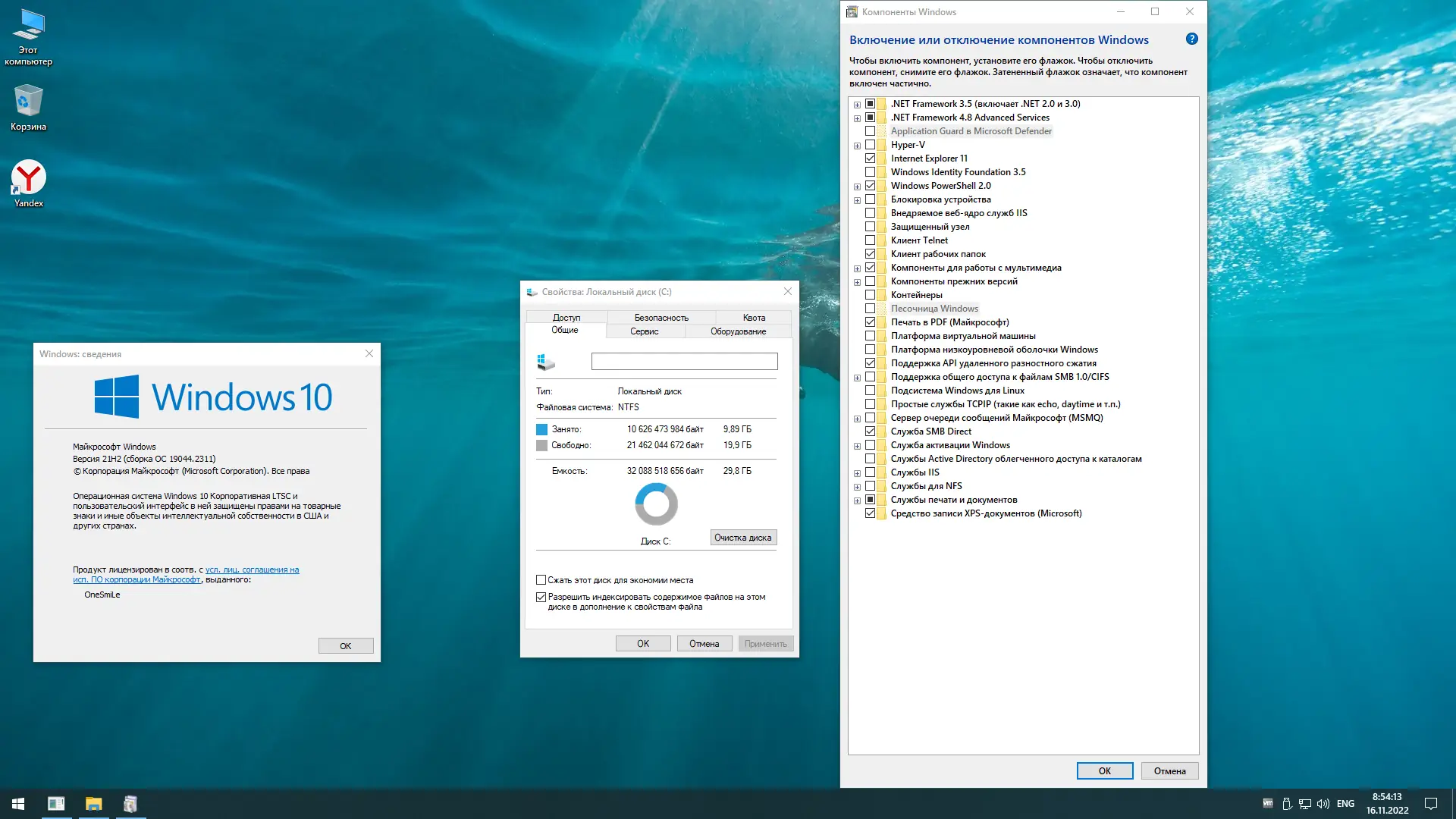 - Удалены ненужные компоненты, такие как Edge, Cortana, Hello-Face, DataCenterBridging и другие, что повышает безопасность и уменьшает нагрузку.