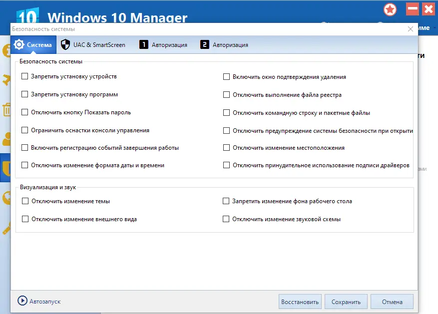 - Безопасность: изменение параметров UAC, шифрование файлов, ограничение доступа, очистка истории и восстановление удалённых данных.