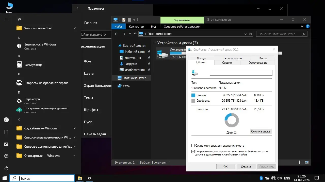 Все лишние фоновые службы, встроенные приложения и компоненты, такие как Defender, Edge, Магазин, Xbox, OneDrive и некоторые системные службы, удалены или отключены для оптимизации работы. Также оставлен дежурный браузер IE 11, файл подкачки уменьшен до 16 Мб, отключена генерация гибернации и зарезервированное хранилище – все ради повышения скорости и освобождения ресурсов.