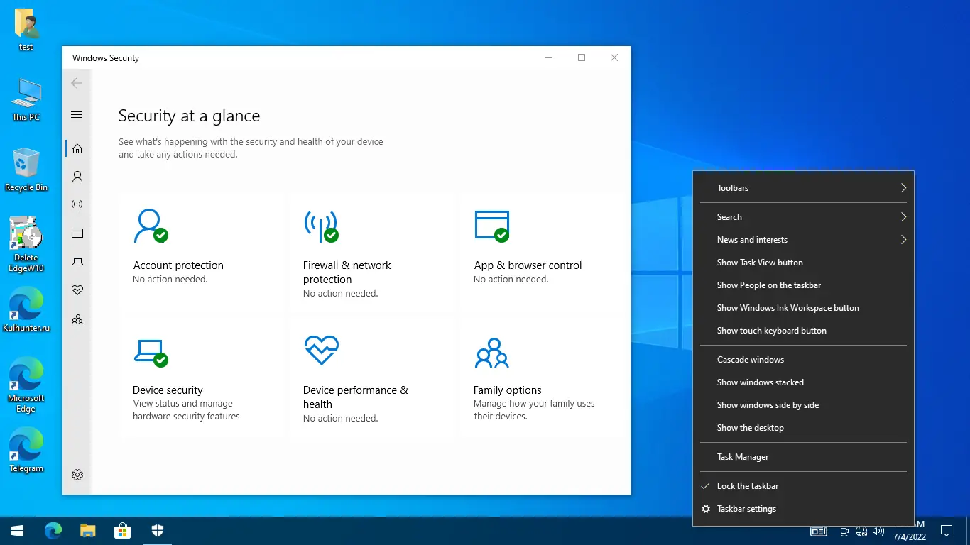 - Настроена панель задач: скрыты контакты и рекомендованные приложения, закреплены необходимые элементы.