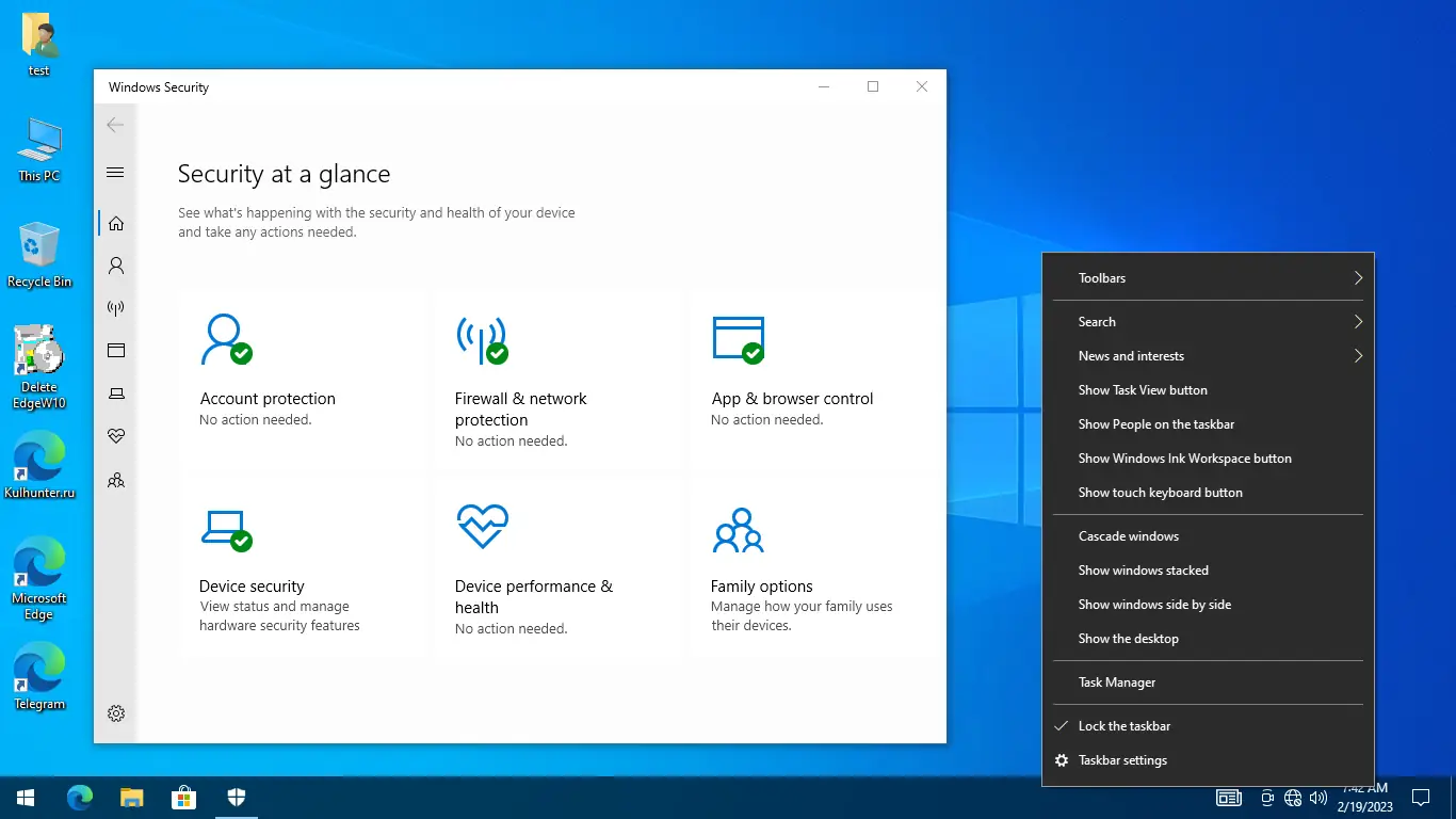 - Скрыты стандартные элементы интерфейса: Кортана, кнопка «Представление задач», контакты в панели задач.