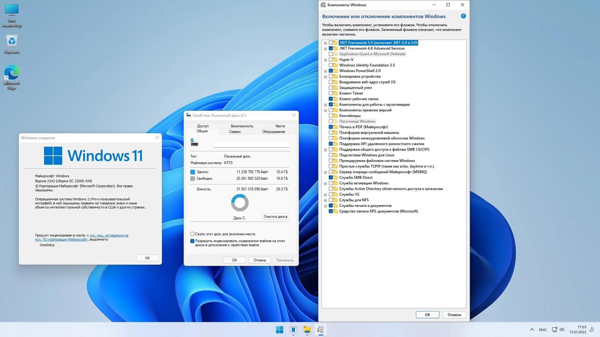 Данная сборка Windows 11 создана из оригинального образа ru-ru_windows_11_business_editions_updated_nov_2021_x64_dvd_f1facebf. В ней полностью удалены все модерн приложения, кроме Edge, а также отключены телеметрия и сторонние службы, что повышает уровень приватности и снижает нагрузку на систему. В образе включены два варианта системы — Windows 11 PRO 21H2 и Windows 11 Enterprise 21H2, что позволяет выбрать наиболее подходящую редакцию. Работа системы осуществляется через инструмент DISM, выполнена очистка папок WinSxS, образ запакован в формат esd для меньшего размера и быстрой установки. Также в сборке реализованы такие функции, как встроенный Windows Defender (выключен по умолчанию с опцией включения/выключения через контекстное меню), нормальное контекстное меню как раньше, отключены автоматические обновления драйверов и функции, грабящие ресурсы системы.