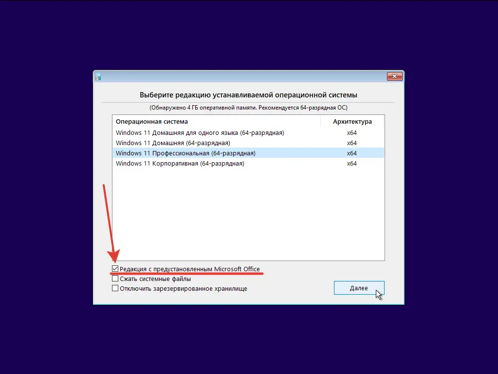 - Возможность выбора редакции Windows и дополнительных опций