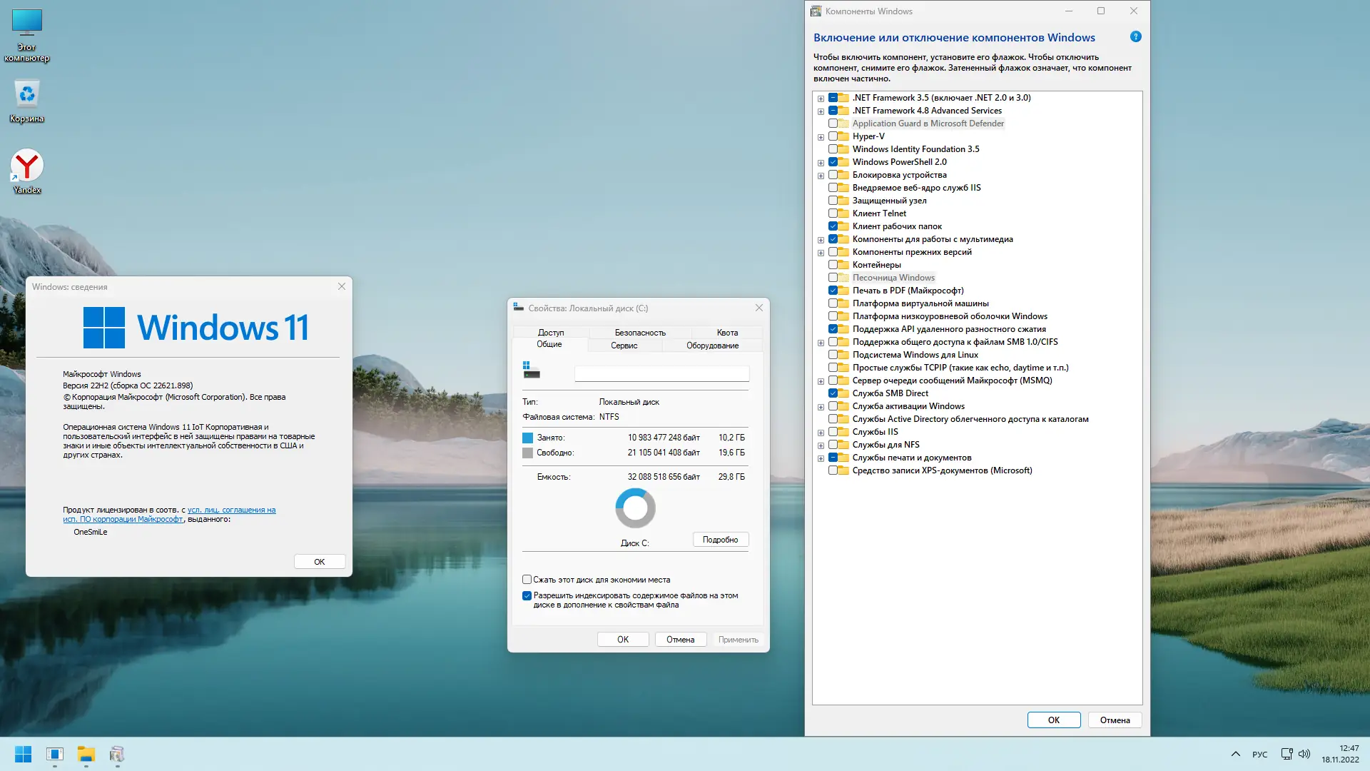 В системе установлены популярные программы: 7-Zip, .NET Framework 3.5 и браузер Yandex, а для пользователей Xbox предусмотрена установка дополнительных приложений через PowerShell команду, что автоматически скачивает и устанавливает магазин и Xbox-сервисы. Обновление и активация системы осуществляются простым вводом ключа или автоматической активацией через встроенные инструменты.