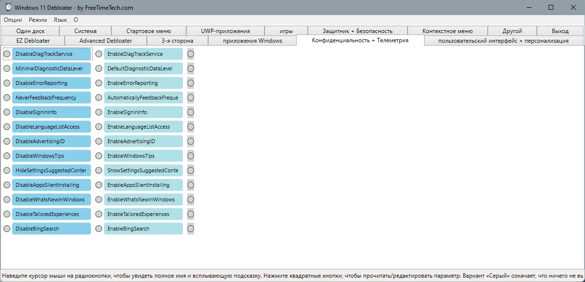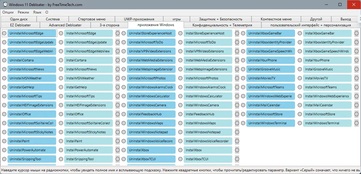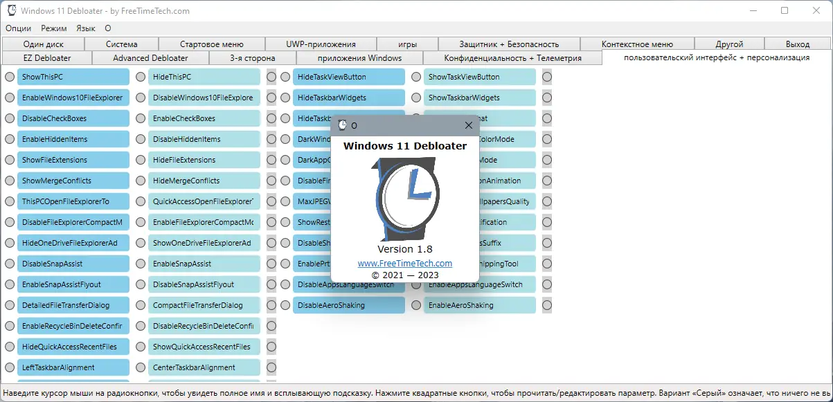 Debloater представляет собой мощный инструмент для настройки Windows 11 с удобным графическим интерфейсом и широким набором функций.