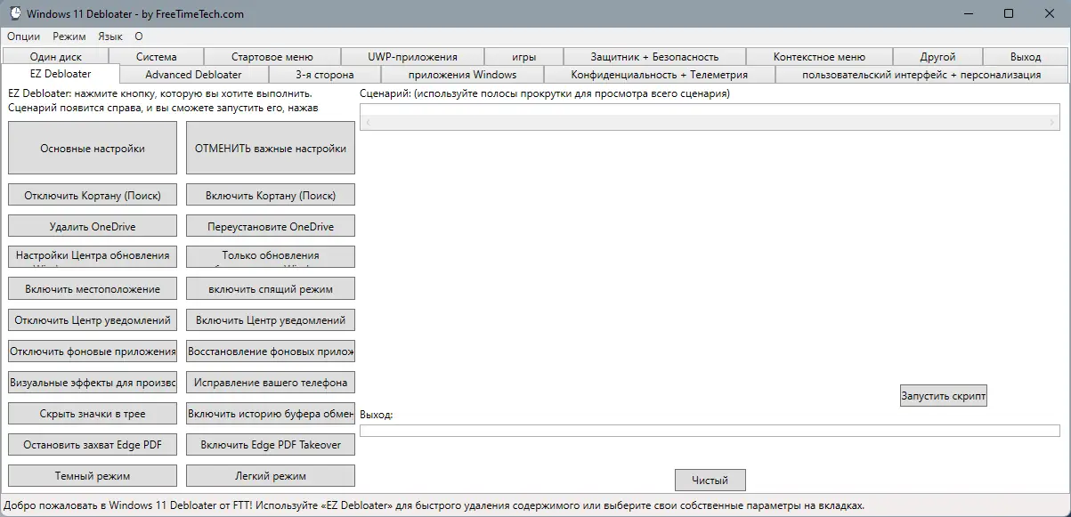 Благодаря дружественному графическому интерфейсу, основанному на известных скриптах с открытым исходным кодом, пользователи могут легко запускать сценарии PowerShell для автоматизации очистки и настройки. Инструмент также позволяет удалять такие стандартные приложения, как Microsoft Edge, OneDrive, Cortana и другие, что способствует снижению фоновых процессов и освобождению ресурсов системы.