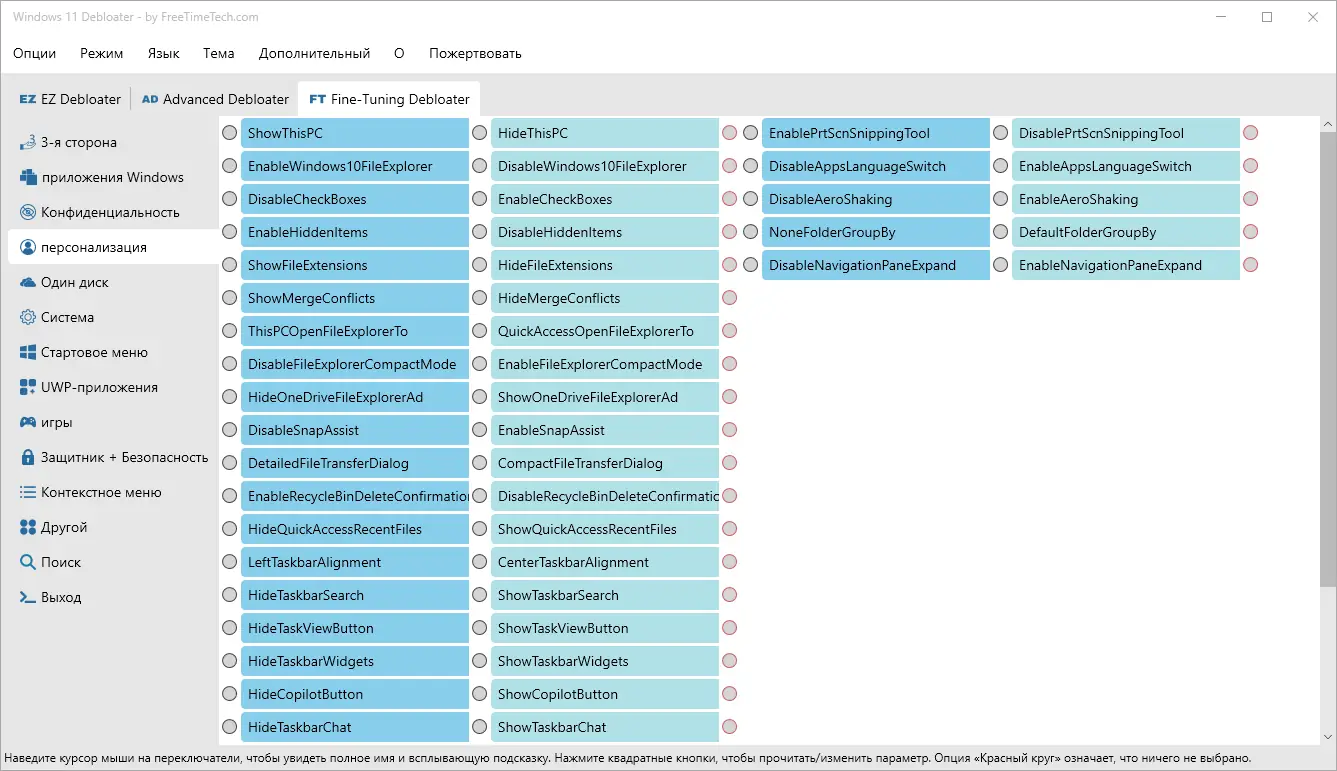Debloater — это универсальная утилита для тонкой настройки и оптимизации Windows 11, а также других версий ОС Windows. Она позволяет быстро удалять предустановленные приложения, отключать службы и настраивать параметры приватности, что обеспечивает более комфортную работу системы и повышает безопасность.