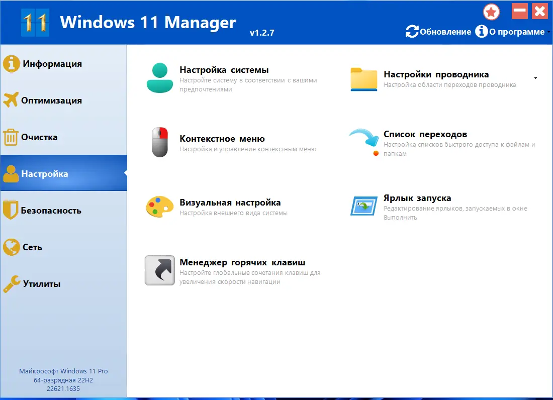 Программа предоставляет широкий набор инструментов для комплексной оптимизации системы и её персонализации. Ее интерфейс интуитивно понятен, а функционал — практически безграничен для работы с Windows 11.