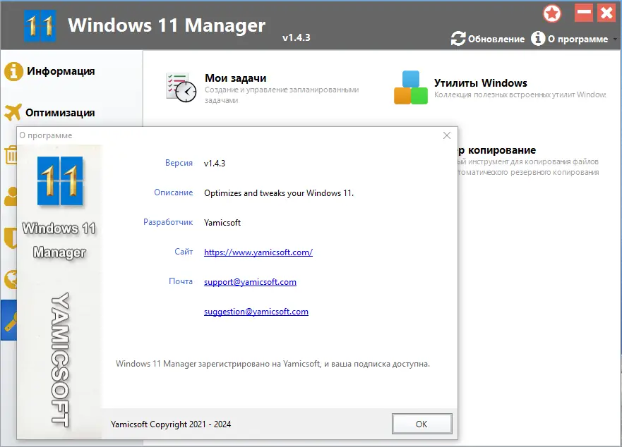 Windows 11 Manager — это универсальный инструмент, созданный специально для пользователей операционной системы Microsoft Windows 11. Он включает в себя свыше сорока различных утилит, предназначенных для повышения производительности, настройки, очистки системы, обеспечения безопасности и восстановления. Эта программа помогает ускорить работу системы, устранить частые системные ошибки, повысить стабильность и безопасность, а также персонализировать внешний вид вашей Windows 11.