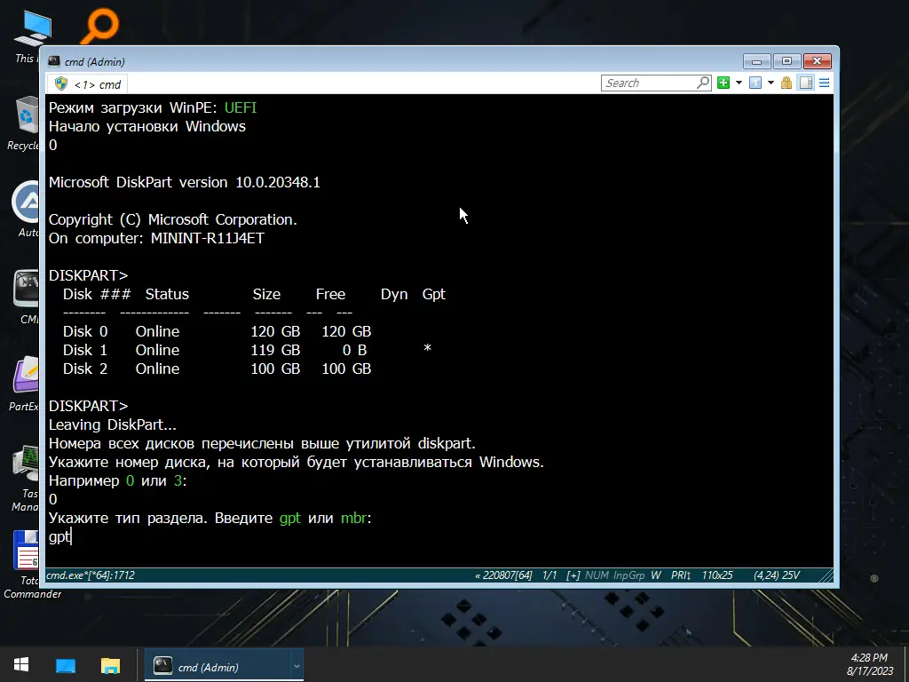 - Следовать указаниям мастера установки, выбрать диск и тип раздела (gpt или mbr) в зависимости от типа системы.