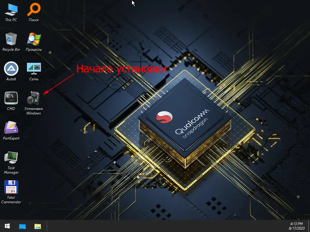 - После загрузки среды WinPE запустить ярлык «Установка Windows» на рабочем столе.