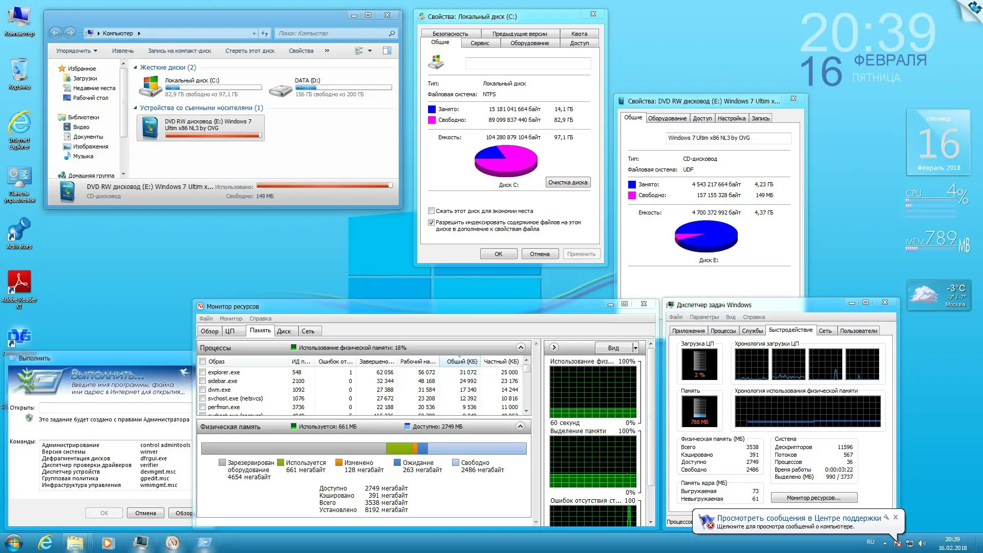 Комплект включает 32-х и 64-х битные версии Windows 7 с ярким оформлением, набором программ, тематическими стилями и гаджетами. Простая для ручной установки из начальной загрузки диска с возможностью проверки оборудования перед установкой. В сборке реализовано предзагрузочное меню для диагностики памяти и жестких дисков, а также поддержка современных технологий установки, включая GPT-диски для 64-битной версии.