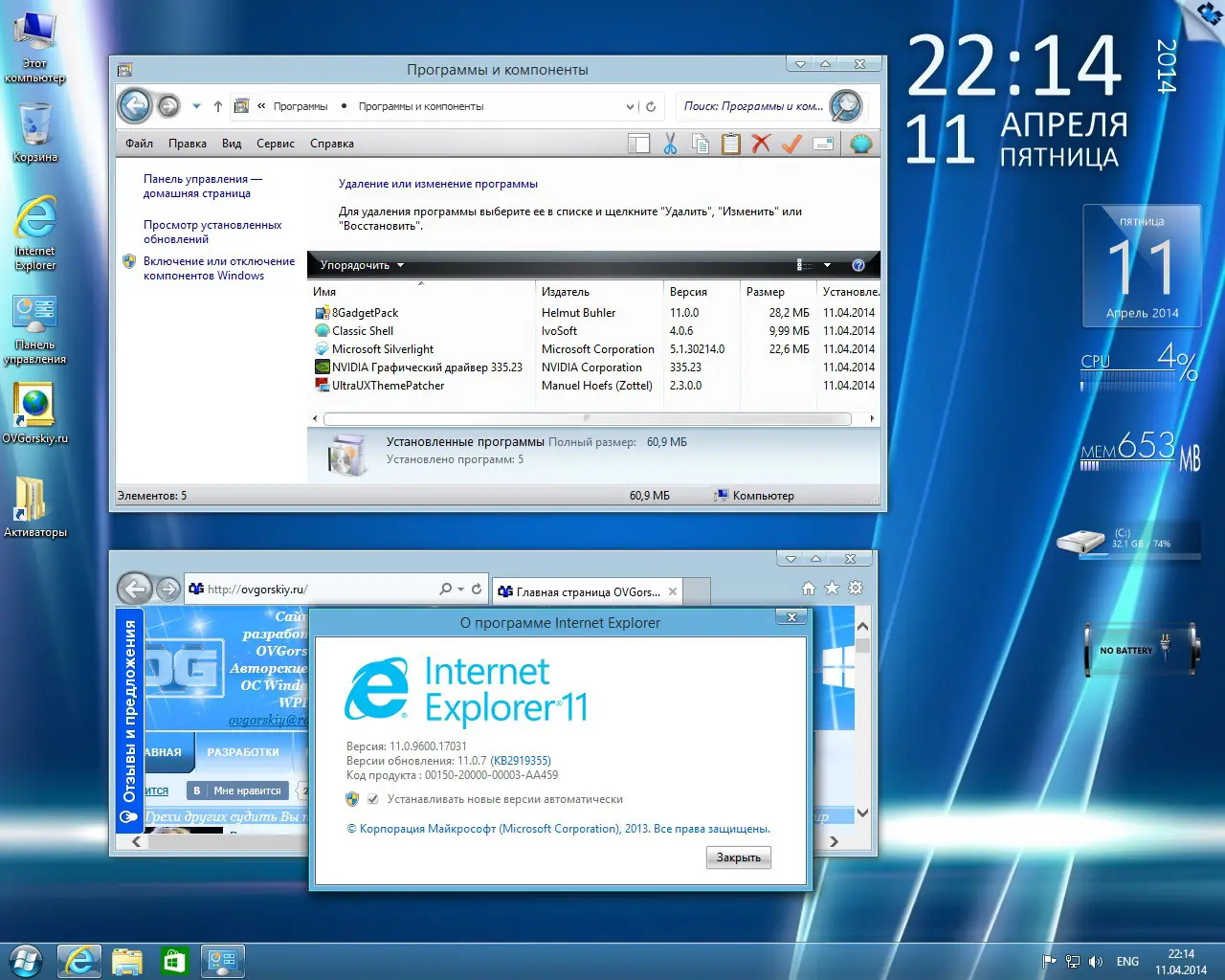 Собрана система с учетом максимальной совместимости и стабильности, протестирована на реальных машинах и не содержит ошибок. В состав включены автоматические установки приложений, таких как Classic Shell, Ultra UXTheme Patcher и 8GadgetPack, что значительно упрощает работу и настройку системы после установки.