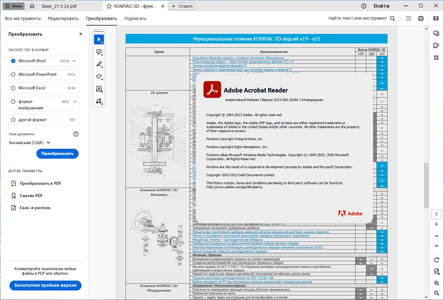 Adobe Acrobat Reader — это универсальное приложение, предназначенное для чтения и обработки PDF-файлов. Используя бесплатную версию, пользователи могут не только просматривать документы, но и добавлять комментарии, заполнять формы, подписывать их электронным способом и экспортировать файлы в форматы Word и Excel. Современное приложение легко интегрируется с облачными сервисами Adobe Document Cloud, что обеспечивает быстрый доступ к документам с компьютеров, мобильных устройств и браузеров. Поддержка Windows 7, 8/8.1, 10, 11 и совместимость с системами x32/x64 Bit делают программу доступной для широкого круга пользователей.