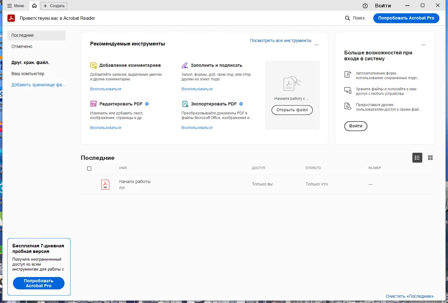 Adobe Acrobat Reader — это надежное и бесплатное приложение Reader для самых важных документов PDF. Работайте с файлами PDF на любых устройствах, будь то компьютер, планшет или мобильный телефон. Программа предлагает больше возможностей, чем просто просмотр — она позволяет редактировать, аннотировать, заполнять формы, подписывать документы и экспортировать файлы в форматы Word или Excel. Благодаря интеграции с облачными сервисами Adobe Document Cloud выполнять задачи стало проще и быстрее. Поддержка Windows 7, 8/8.1, 10 и 11 позволяет использовать программу на современных системах, а также на более старых. Возможность скачать бесплатно на русском языке позволяет всем пользователям быстро начать работу и повысить эффективность своих задач.