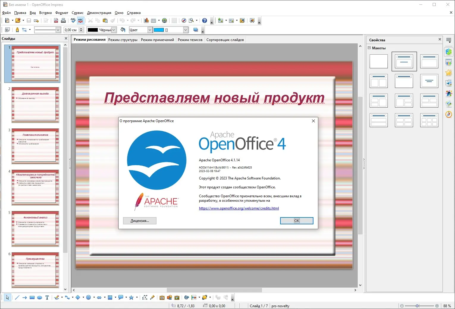 OpenOffice — это бесплатная альтернатива пакету Microsoft Office, включающая в себя несколько мощных приложений для работы с текстами, таблицами, презентациями, графикой, базами данных и математическими формулами. Благодаря совместимости с форматами MS Office, пользователи могут легко работать с документами в их привычном виде, а также сохранять результаты в формате PDF. Все компоненты системы интегрированы в одно ядро, что обеспечивает надежную совместимость и удобство использования.