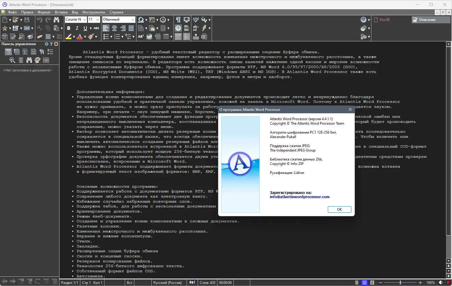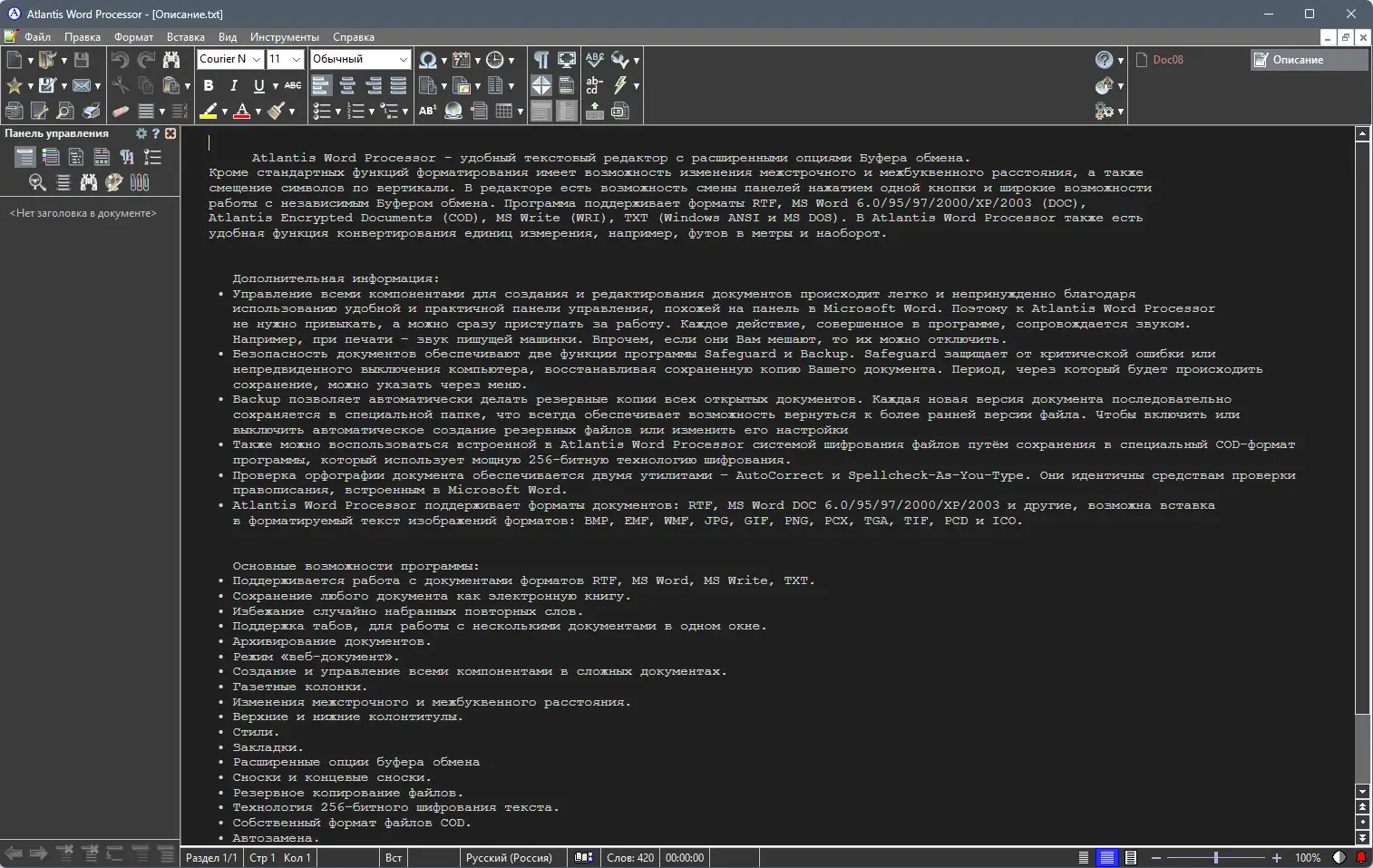 Программа обладает интуитивно понятным управлением через панель, напоминающую интерфейс Microsoft Word, что позволяет займиться созданием или редактированием документов без долгого привыкания. Встроенные функции шифрования и архивации обеспечивают сохранность конфиденциальных данных. Также доступна возможность работы с несколькими документами одновременно — в отдельных вкладках, а режимы отображения позволяют настроить рабочее пространство под свои нужды. Пользователи способны создавать сложные документы с газетными колонками, сносками, колонтитулами, стилями и закладками. Atlantis Word Processor отлично подходит для подготовки профессиональных отчетов, статей и электронных книг.