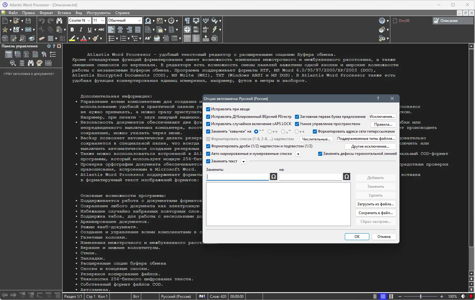 Atlantis Word Processor — это мощный текстовый редактор, способный удовлетворить потребности как начинающих пользователей, так и профессиональных писателей. Он предлагает широкий спектр функций, сравнимых с популярными офисными пакетами, включая поддержку форматов DOC, DOCX, RTF, TXT и возможность вставки изображений в разнообразных форматах. Благодаря полностью настраиваемому интерфейсу, автоматической проверке орфографии, расширенным возможностям форматирования и автоматическому резервному копированию, Atlantis Word Processor делает работу с текстом максимально удобной и безопасной.