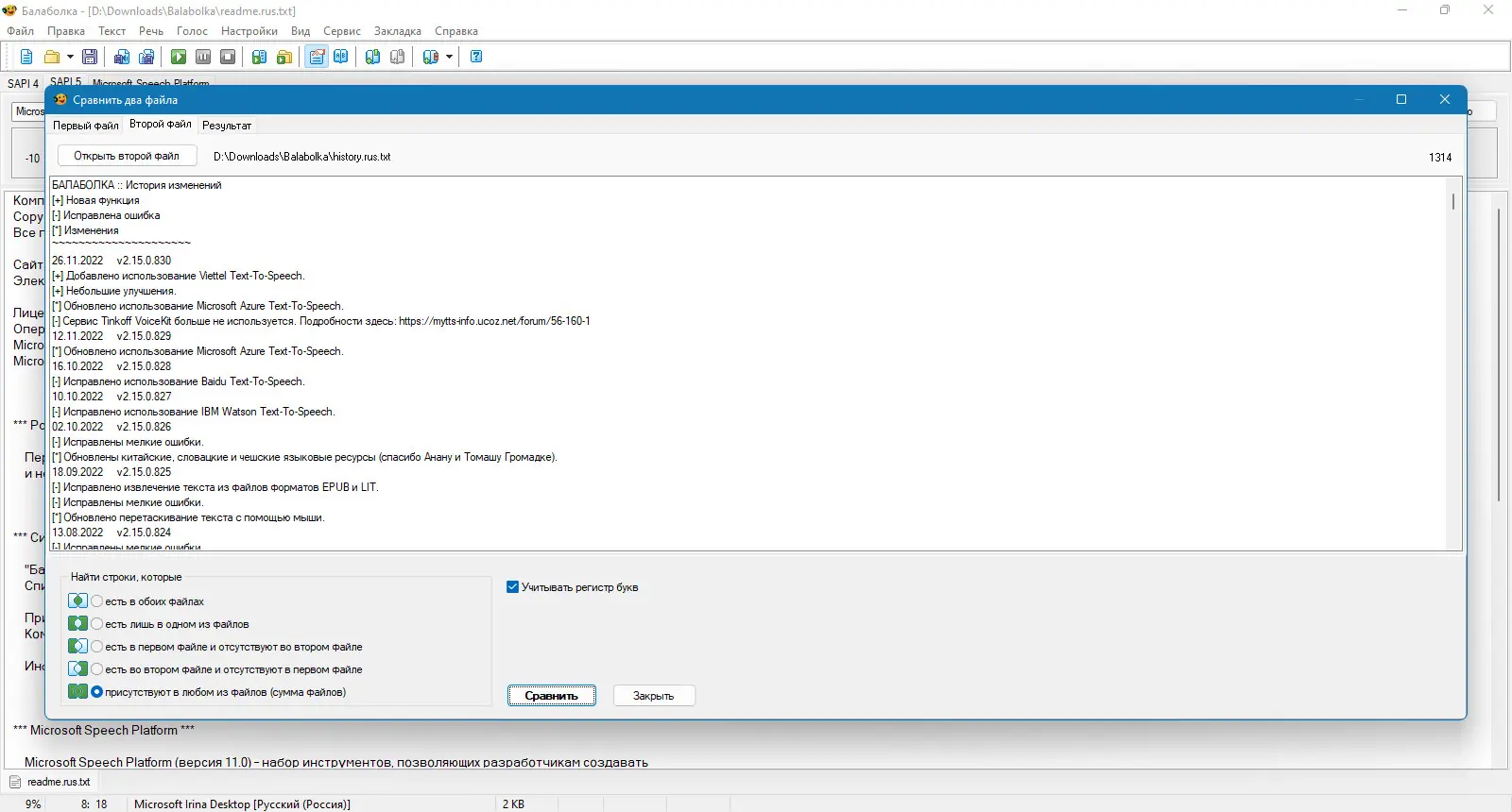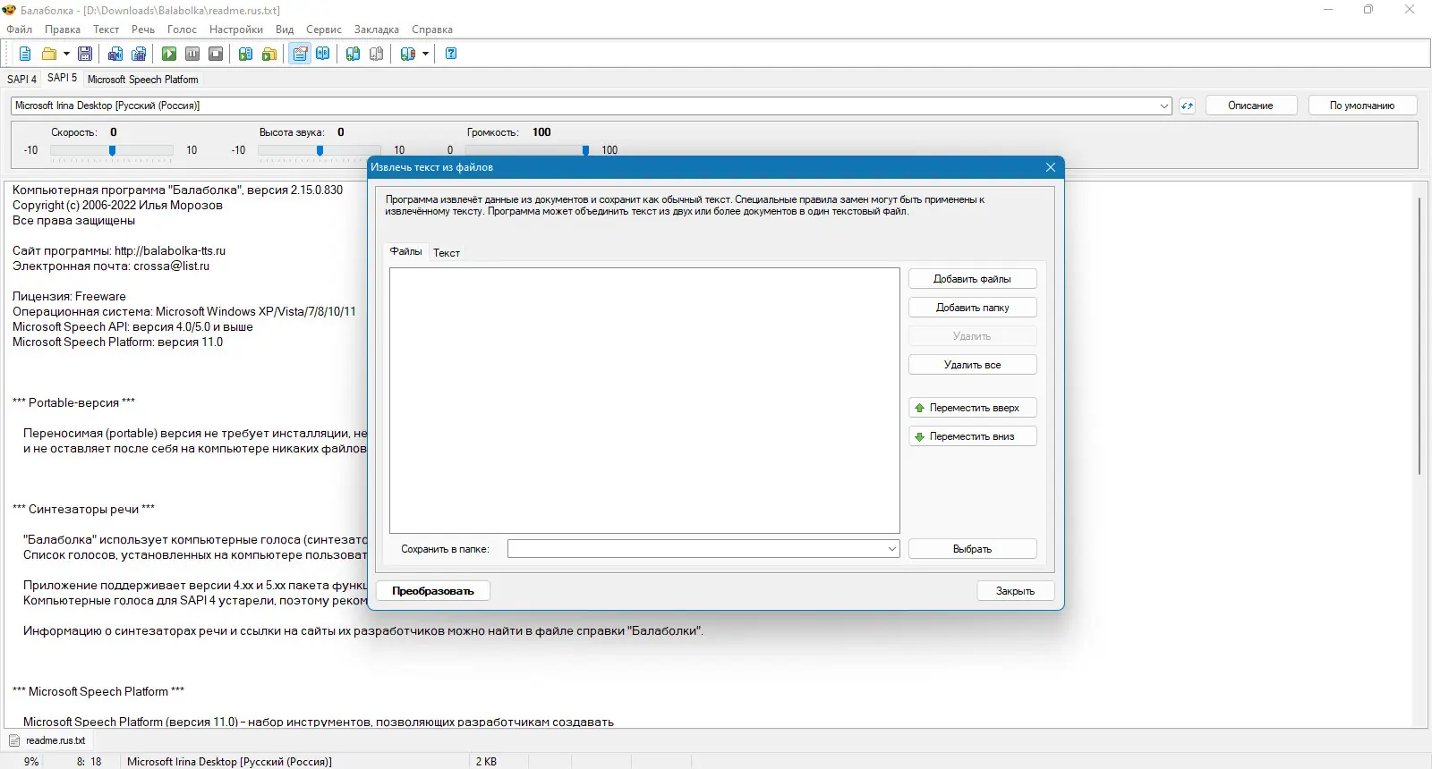 Также благодаря поддержке различных версий Microsoft Speech API (SAPI), программа обеспечивает качественную и гибкую работу с голосами. Возможность сохранять проговариваемый текст в тегах ID3 или файлах формата LRC позволяет синхронно отображать текст при воспроизведении звука. Это делает «Балаболку» ценным инструментом для тех, кто занимается озвучкой книг, созданием аудиоконтента или автоматической озвучки с помощью нейросетей и технологий tts.