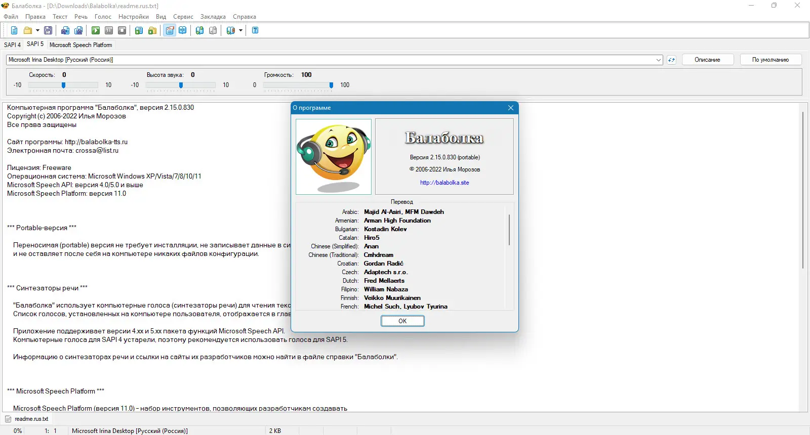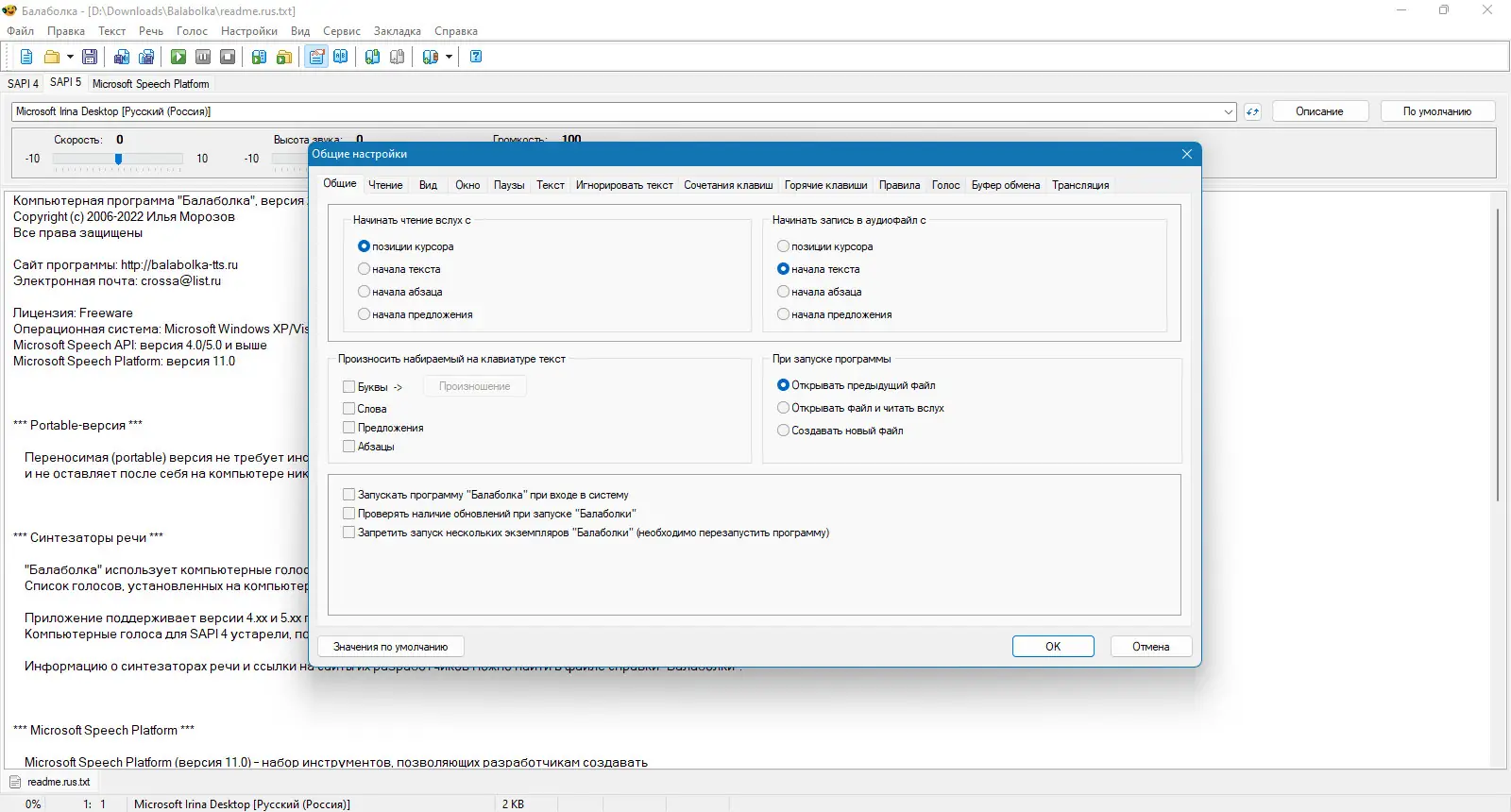 Обратите внимание, что для корректной работы программы необходимо наличие на системе хотя бы одного речевого синтезатора, совместимого с Windows.