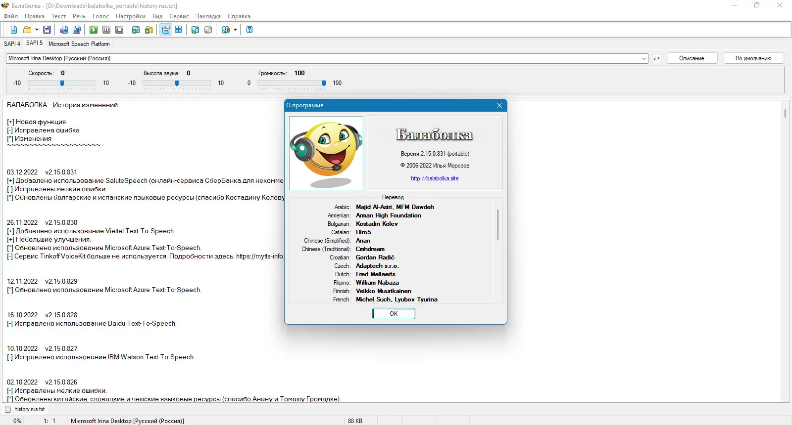 Обратите внимание, что для корректной работы требуется наличие речевых движков и поддержки голосовых функций Microsoft Speech API (SAPI).