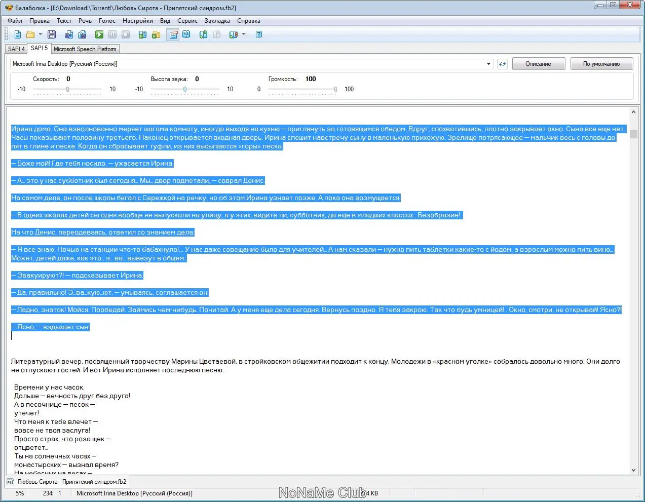 Балаболка предназначена для чтения вслух текстовых файлов различного формата, включая DOC, PDF, EPUB, MOBI и многие другие. Работая с любыми речевыми синтезаторами, установленными на компьютере, программа позволяет реализовать как простое чтение, так и сложные сценарии озвучивания, включая изменение тембра и скорости речи. Кроме того, программный продукт поддерживает создание аудиофайлов в популярных форматах WAV, MP3, MP4, OGG и WMA, что делает его универсальным инструментом для озвучивания и аудиозаписи текста.