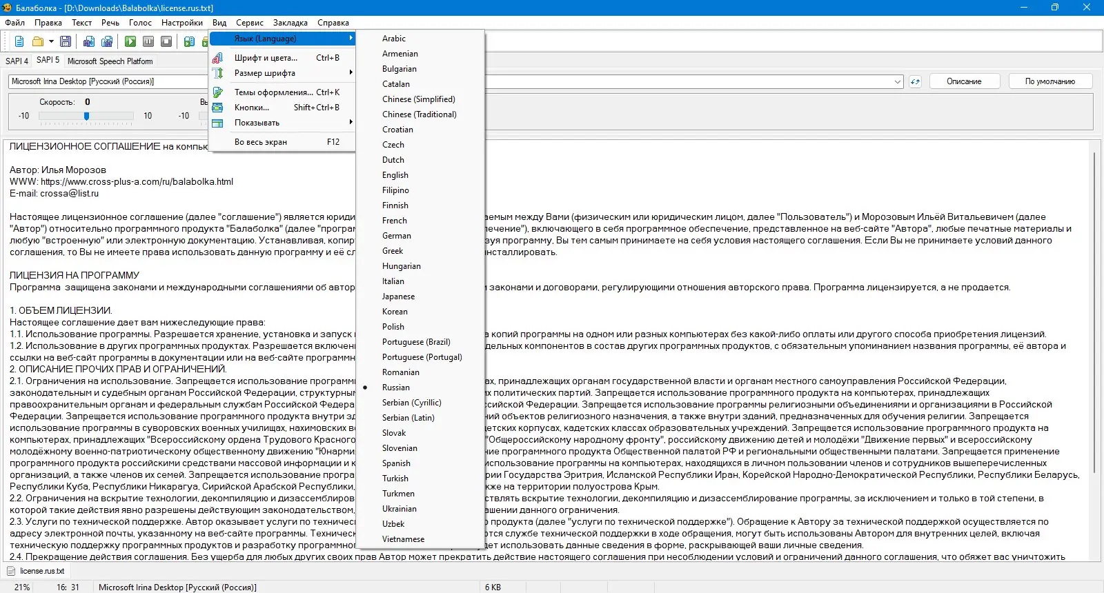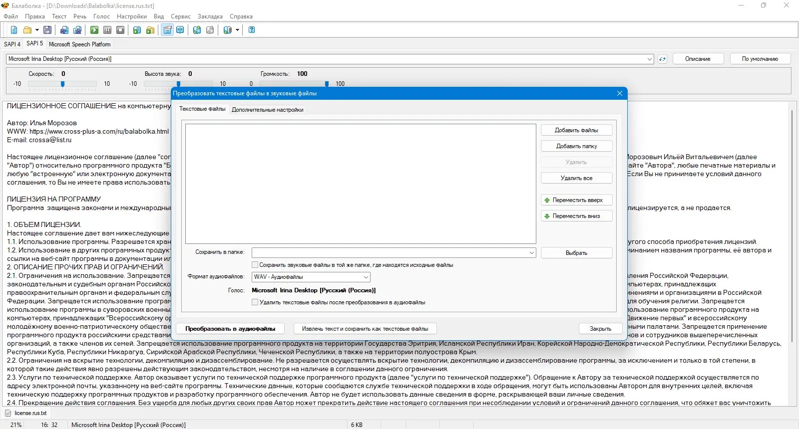 Balabolka — это мощная программа для чтения вслух текстовых файлов с возможностью создания аудиофайлов и настройки голосовых параметров.