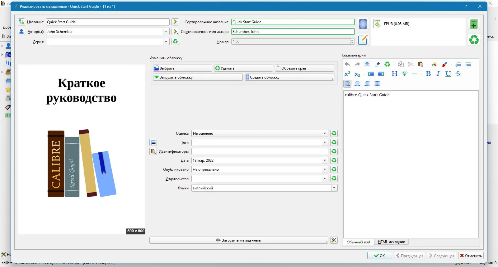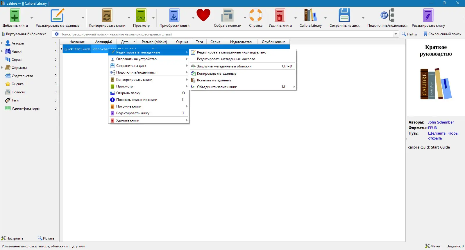 - Автоматический поиск метаданных и обложек в интернете по названию, автору или ISBN.