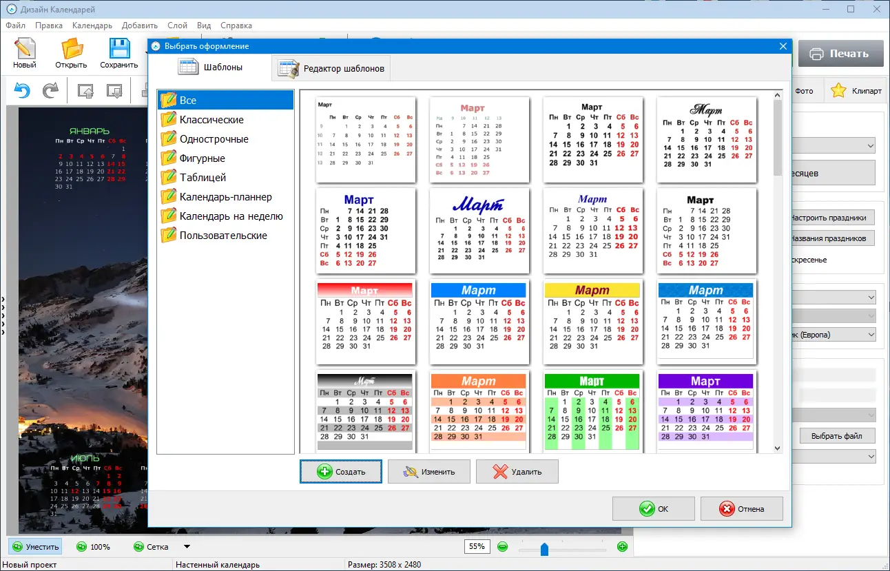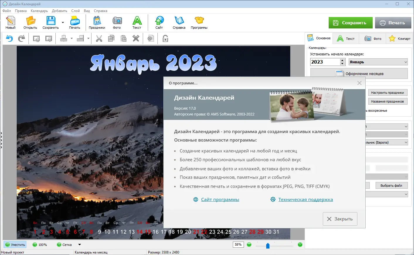 - Возможность создания персональных, рекламных и праздничных календарей
