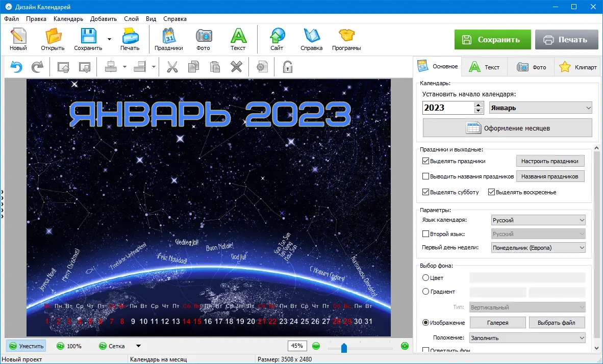 Дизайн Календарей — это простая в освоении программа, позволяющая быстро создавать календари на любой год или месяц. Она предлагает широкий выбор форматов: настольные, настенные, карманные, перекидные, а также возможность редактировать любой элемент оформления. В комплект входит более полусотни профессиональных шаблонов и фоновых изображений, разделённых по темам, что значительно ускоряет процесс дизайна. Программа позволяет добавлять фотографии в качестве фона или поверх композиции, оформлять их рамками и масками. Также предусмотрена настройка групп праздников, выделение выходных и праздничных дней, а поддержка двух языков — русский и английский — делает создание календарей удобным для пользователей по всему миру. Создавайте календари высокого качества, подходящие для печати и распространения как в домашних, так и в бизнес-целях. Доступна экспортировка в различные форматы файлов и возможность тиражирования в типографиях.