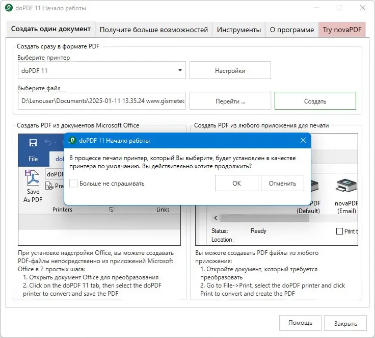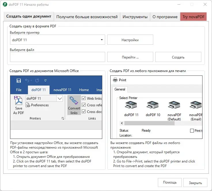 doPDF — это удобная и функциональная программа для преобразования различных типов документов в формат PDF. Она поддерживает работу с множеством форматов файлов, включая документы Word, Excel, PowerPoint, сообщения почты и веб-страницы, что позволяет легко создавать защищённые и профессиональные PDF-файлы. После установки в папке «Принтеры» появляется виртуальный принтер, через который осуществляется процесс конвертации. Всё, что требуется — отправить любой документ на печать через этот виртуальный принтер, и он автоматически превратит его в PDF.