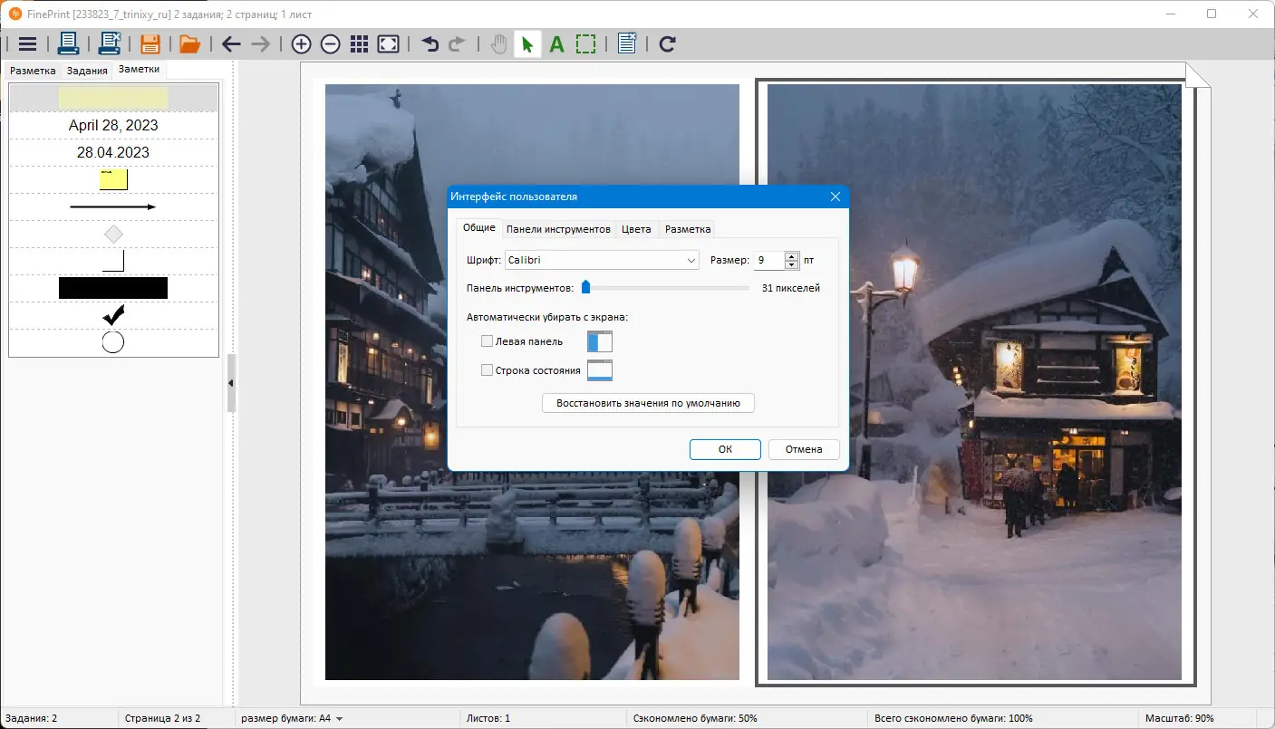 - Отображение сэкономленной бумаги и чернил