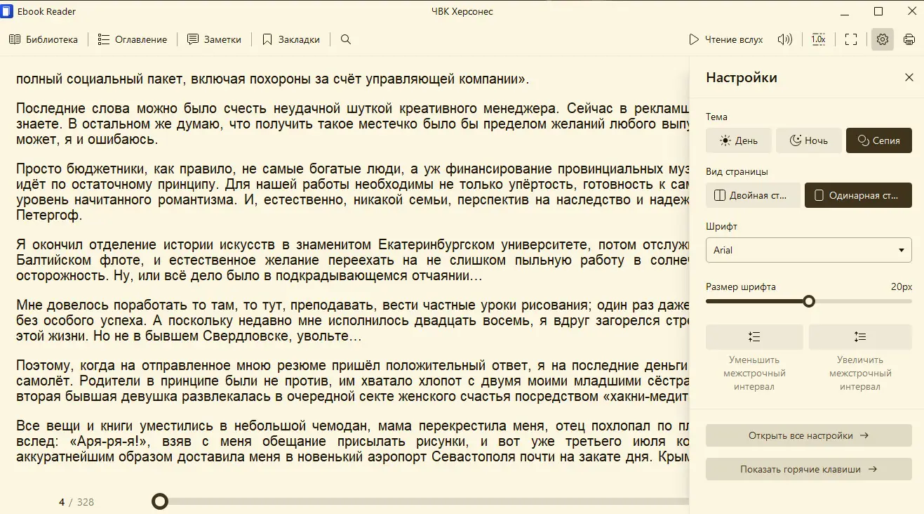 - Разнообразные режимы чтения, включая ночной и полный экран.