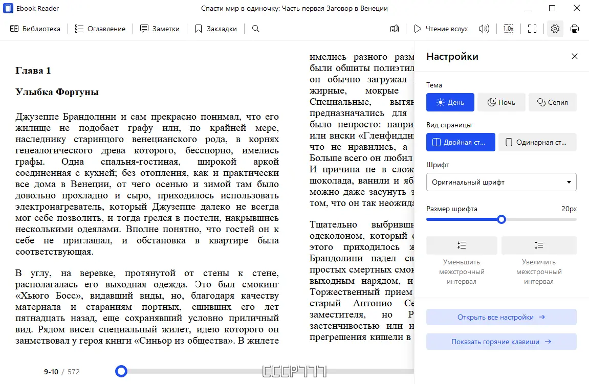 - Возможность добавлять заметки, закладки и переводить текст.