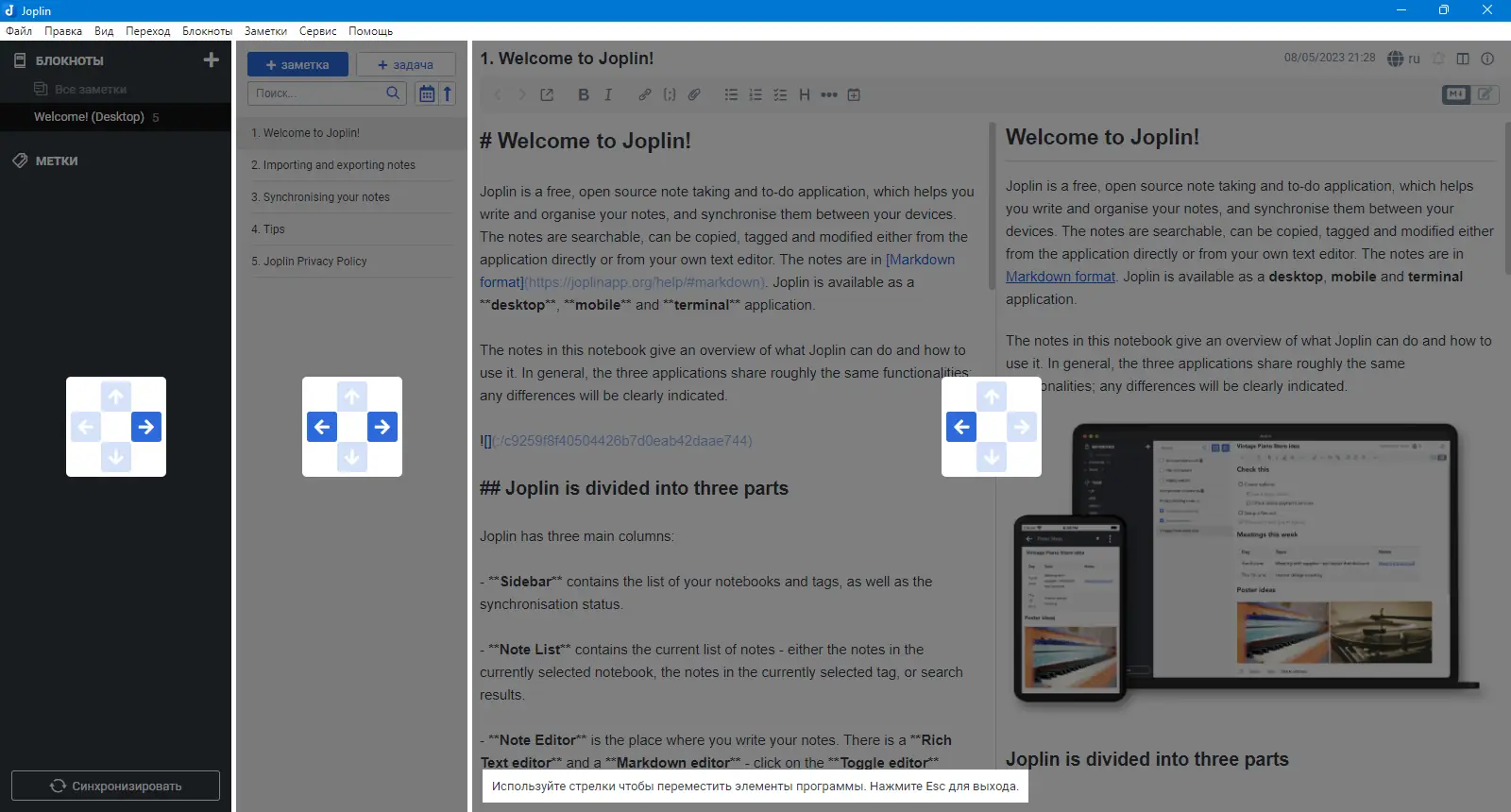 Joplin — это мощный инструмент для ведения заметок, задач и дел с возможностью организации данных в блокноты, использования тегов и поиска. Приложение полностью открытое и поддерживает работу на Windows, macOS, Linux, Android и iOS, что позволяет пользователю работать со своими данными независимо от используемого устройства. Помимо этого, интеграция с облачными сервисами, такими как Nextcloud, Dropbox, OneDrive и WebDAV, обеспечивает надежную и безопасную синхронизацию информации. Импорт заметок из Evernote, в том числе сохранение метаданных и мультимедийных файлов, делает переход на Joplin максимально плавным.