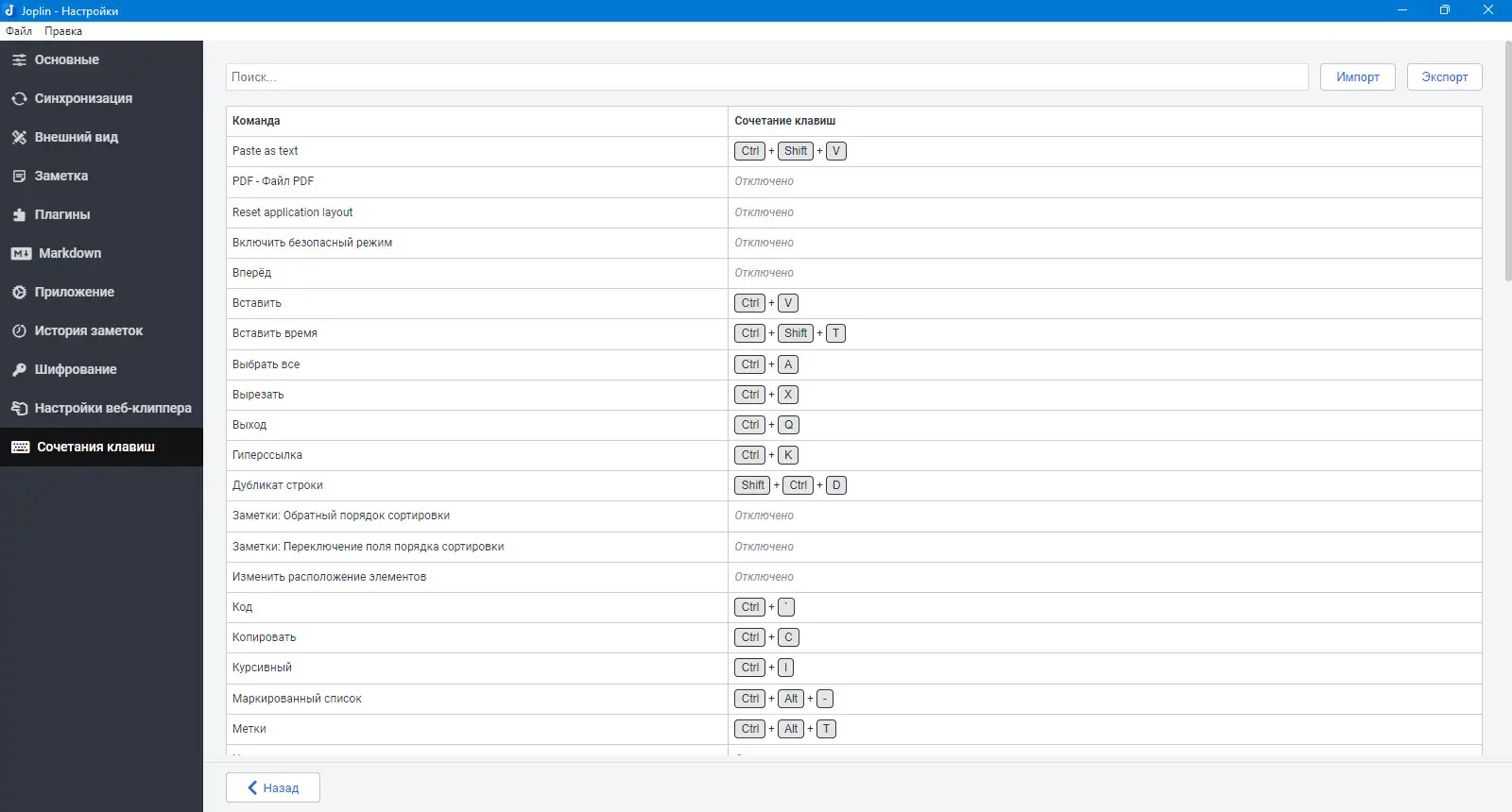 - Возможность импортировать данные из других приложений и экспортировать в Markdown.