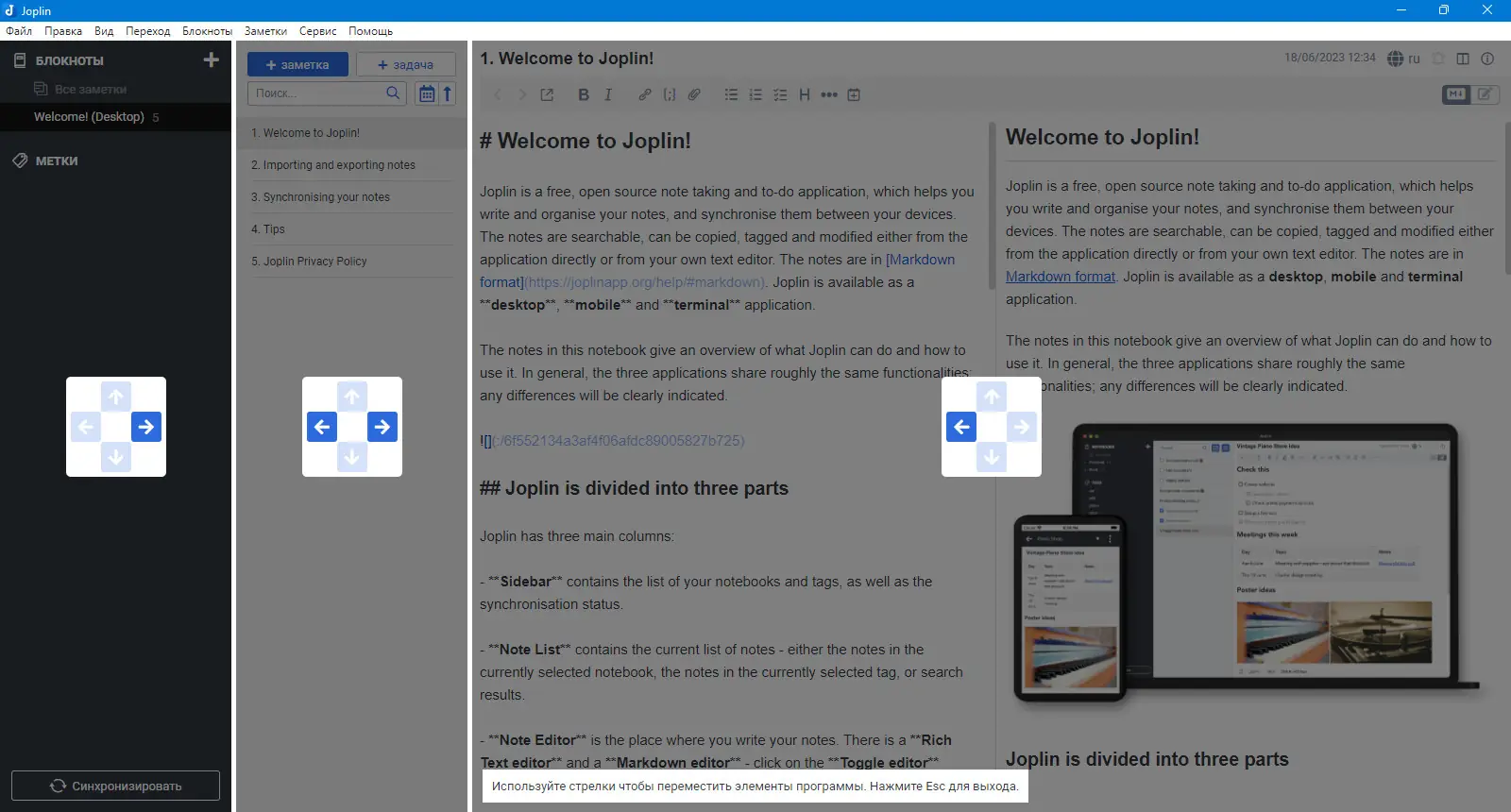 Joplin предназначен для эффективного ведения заметок в формате Markdown. Пользователи могут импортировать заметки, созданные в Evernote, включая вложения и метаданные, такие как геолокация или время создания. Поддержка облачной синхронизации с сервисами вроде Nextcloud, Dropbox, OneDrive или WebDAV обеспечивает доступ к заметкам с различных устройств. Каждая заметка хранится в виде обычных текстовых файлов и легко восстанавливается или переносится, что делает систему максимально прозрачной и гибкой.
