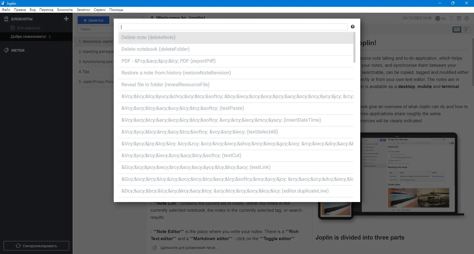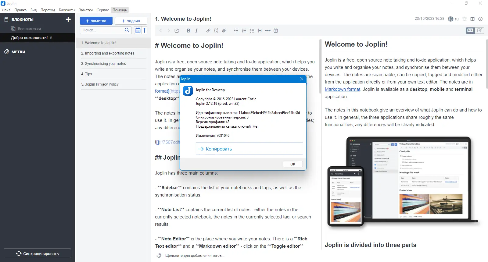 Joplin — это мощное и универсальное решение для ведения заметок, которое поддерживает организацию данных в блокнотах, пометки и экспортированные заметки из других сервисов, таких как Evernote. Все заметки хранятся в формате Markdown и легко доступны для копирования, редактирования и поиска как в самом приложении, так и во внешних текстовых редакторах. Благодаря поддержке синхронизации с облачными сервисами, такими как Nextcloud, Dropbox и WebDAV, пользователи могут иметь доступ к своим заметкам с любого устройства. Импорт ресурсов и метаданных, включая изображения, вложения и геолокацию, позволяет сохранять полную структуру и форматирование контента. Современное приложение идеально подойдет для тех, кто ценит открытость, гибкость и надежность в организации информации.