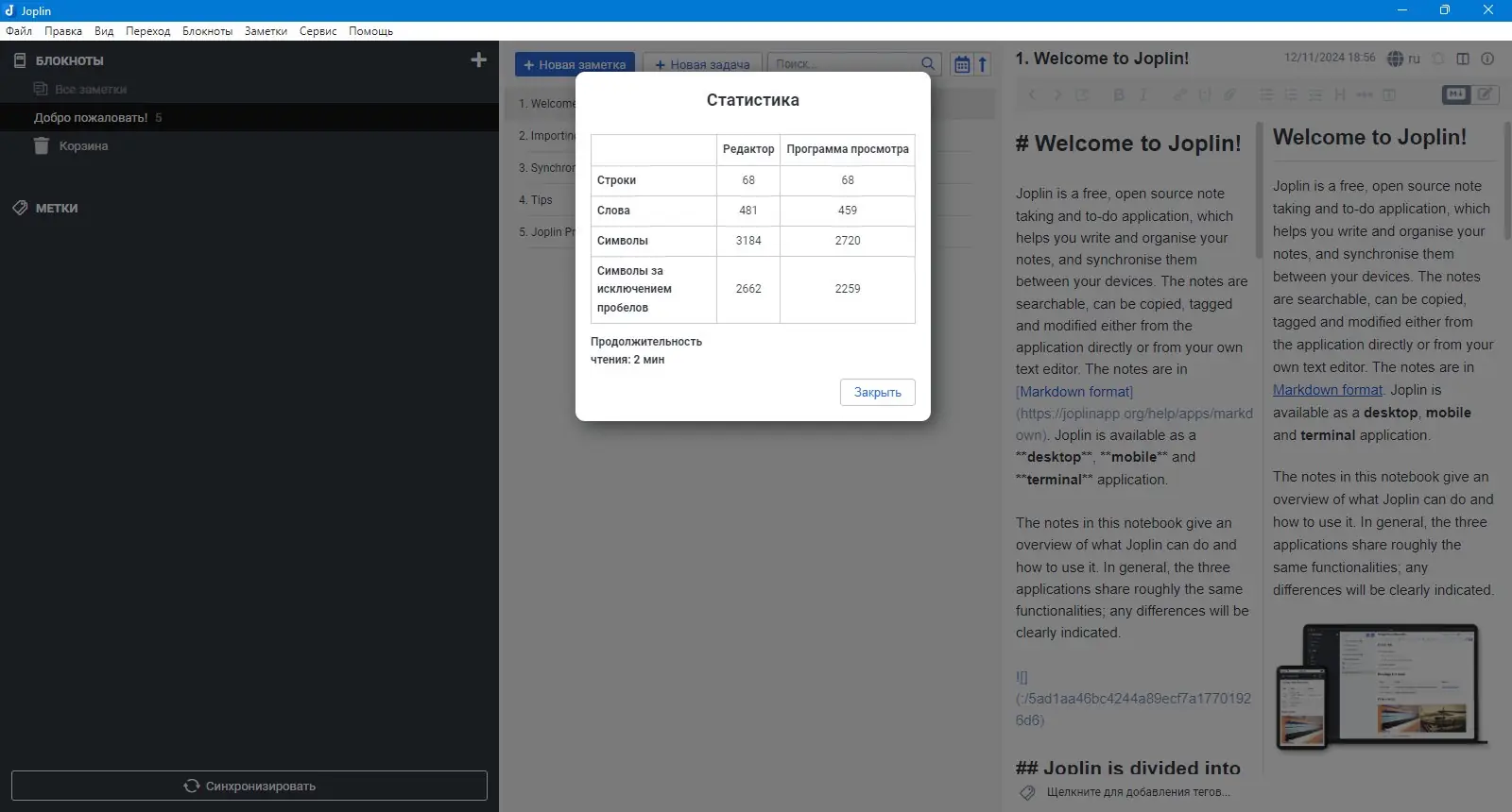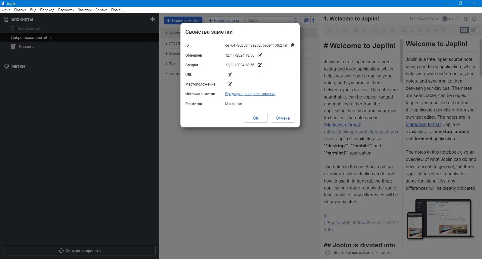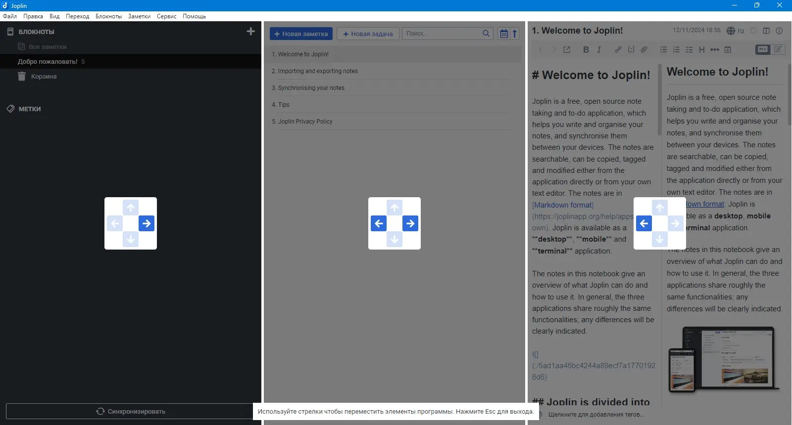 Joplin — это бесплатное приложение с открытым исходным кодом, предназначенное для организации заметок, дел и информации в удобной структурированной системе. Оно позволяет обрабатывать большое количество заметок, которые сохраняются в блокнотах и доступны для быстрого поиска. За счёт поддержки формата Markdown, пользователи могут легко копировать, редактировать и форматировать свои заметки как внутри приложения, так и в сторонних текстовых редакторах. Импорт данных из Evernote и других сервисов осуществляется без потери форматирования, ресурсов и метаданных — таких как геолокация, дата создания и обновления. Кроме того, Joplin поддерживает синхронизацию с популярными облачными сервисами, включая Nextcloud, Dropbox, OneDrive и WebDAV. Это обеспечивает удобное хранение и резервное копирование заметок, а также их доступность с различных устройств.