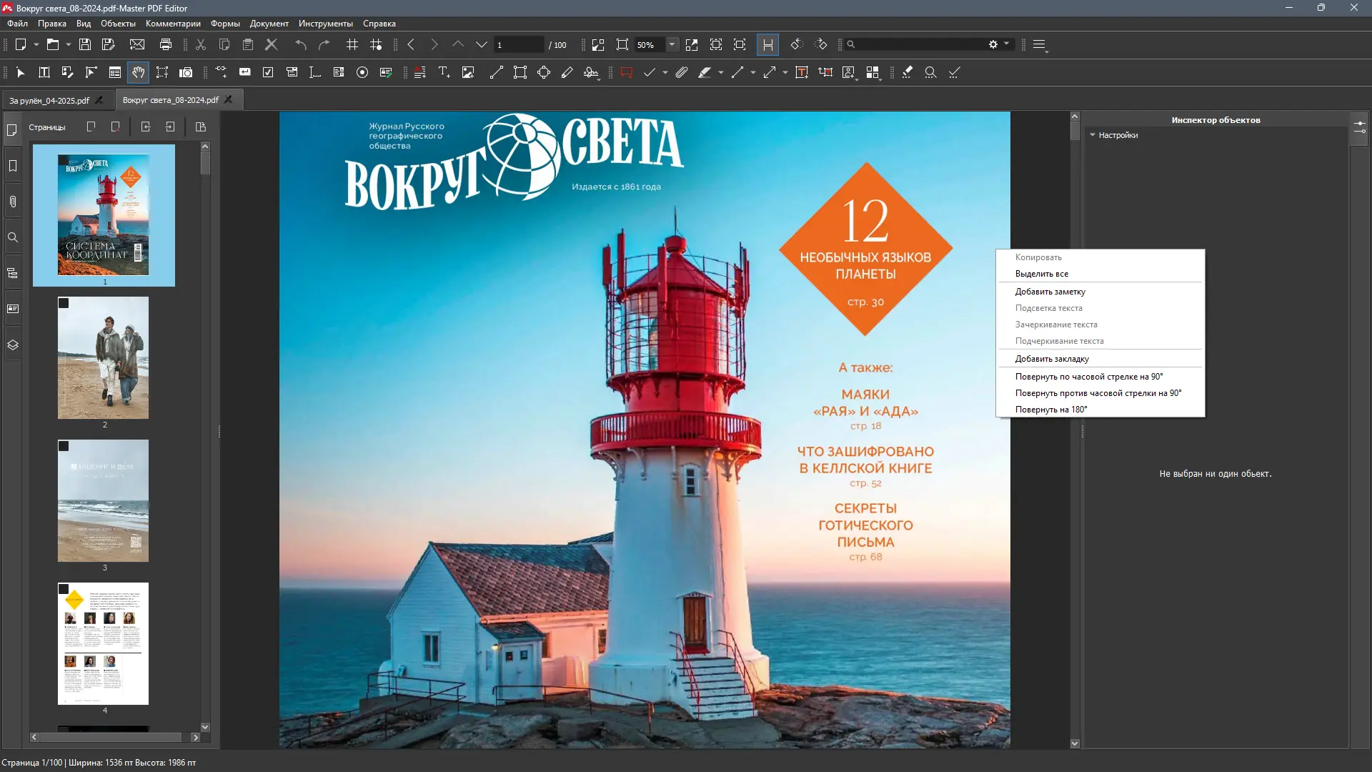- Операции со страницами: объединение, разделение, удаление, вставка и поворот страниц, изменение их размера и порядка.
