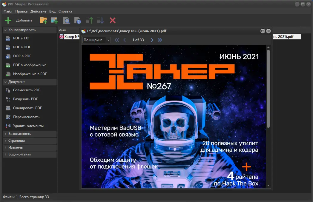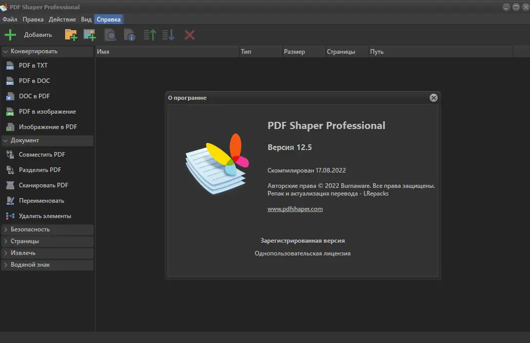 PDF Shaper — мощная программа для работы с PDF-документами, которая предоставляет широкий набор инструментов для их модификации, оптимизации и преобразования. Благодаря удобному интерфейсу и богатому функционалу, пользователи смогут легко разделять и объединять PDF-файлы, извлекать текст, графику, страницы или изображения, а также шифровать и расшифровывать документы при помощи пароля. Программа также поддерживает конвертацию изображений и документов различных форматов в PDF, а также преобразование Word документов в PDF и обратно. Это универсальное решение подходит как для личного, так и профессионального использования, обеспечивая полный контроль над содержимым ваших PDF-файлов.